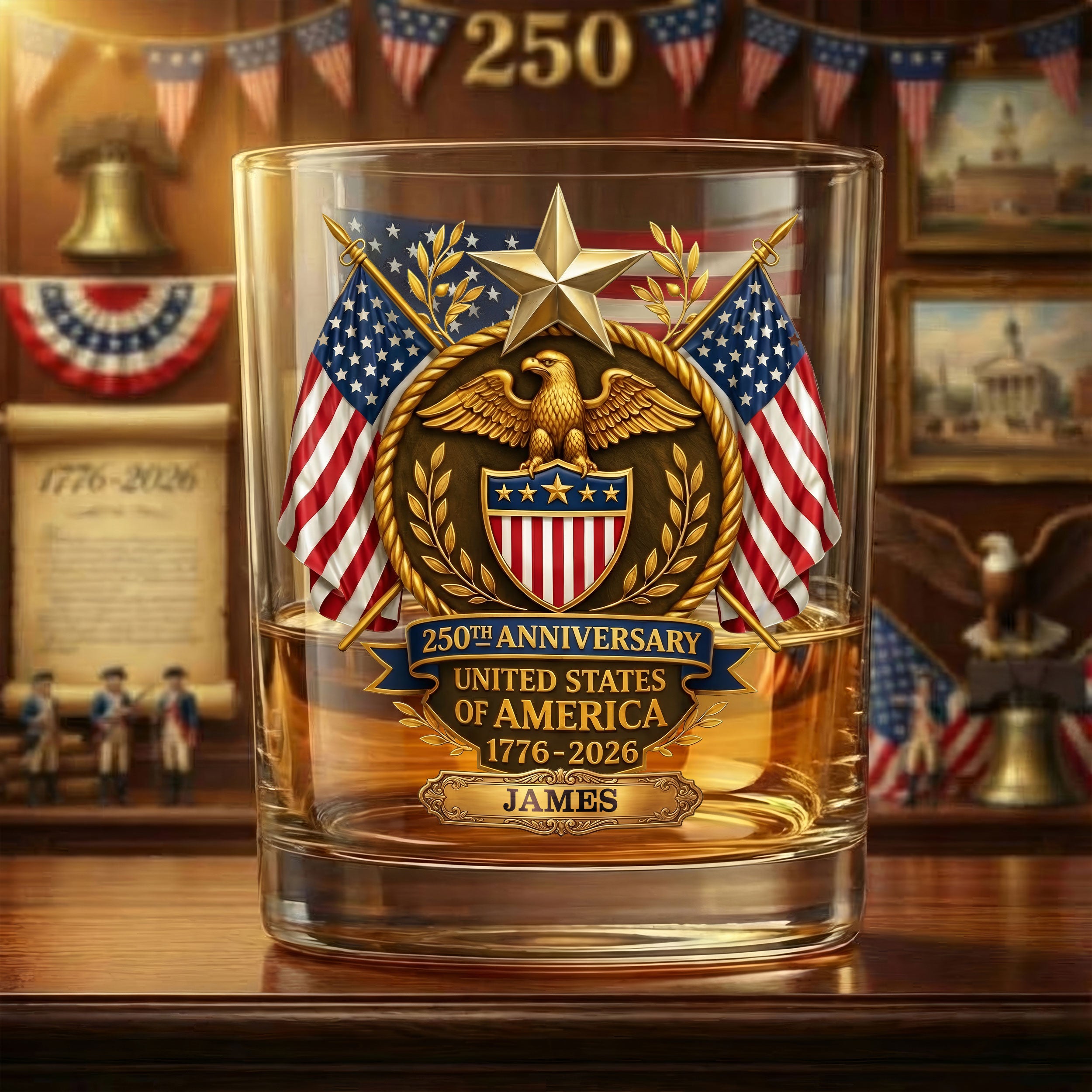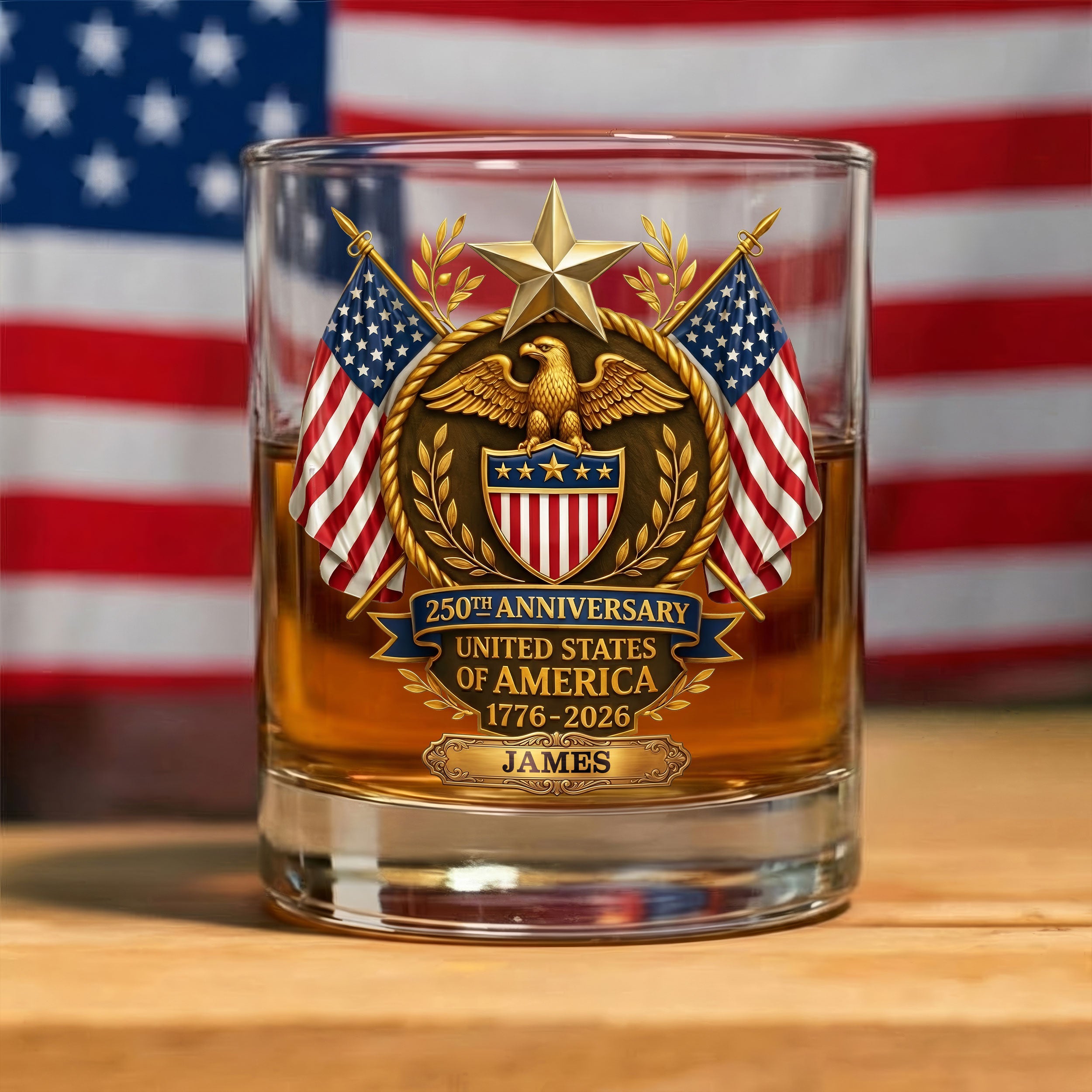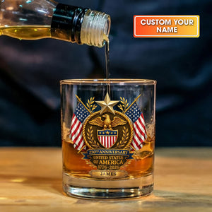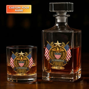 250th Anniversary Eagle Shield US Flag Stars Whiskey Decanter Set, America Patriot Whiskey Glasses