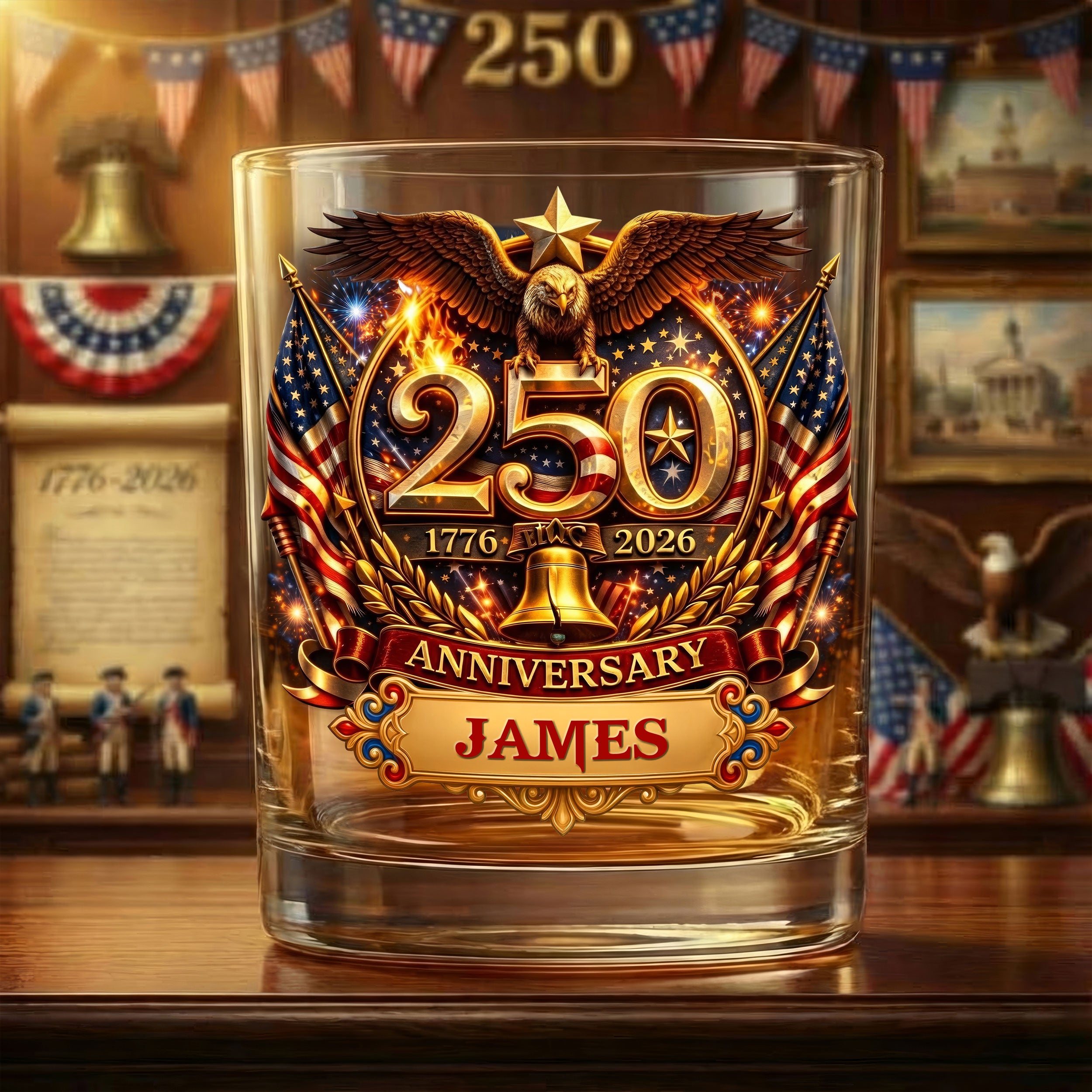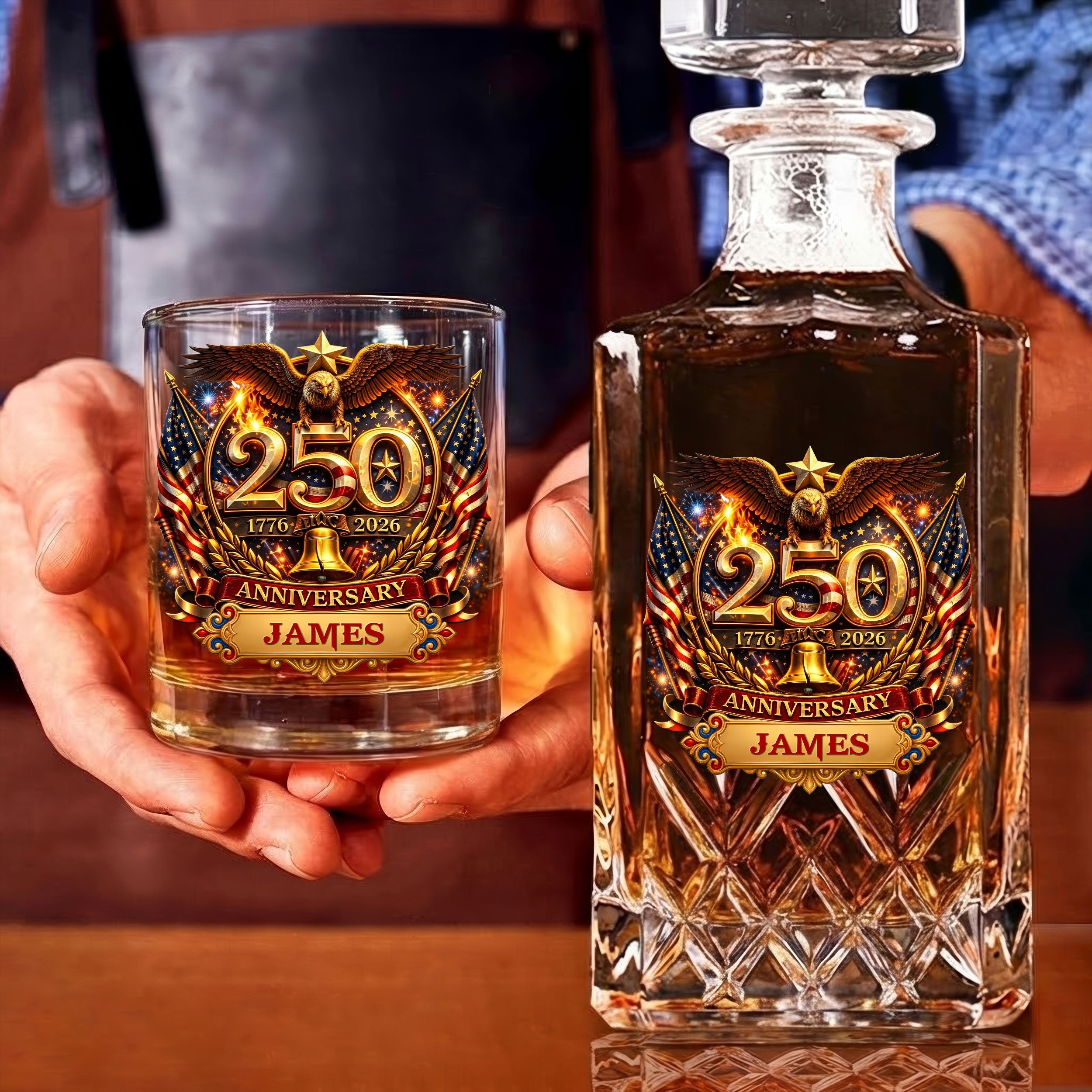 250th Anniversary Liberty Bell Flag And Bald Eagle Whiskey Decanter Set, America Patriot Whiskey Glasses