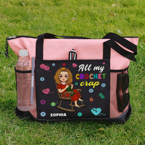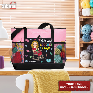 The tote features a delightful design with the quote "All My Crochet Crap" capturing the spirit of yarn lovers everywhere. The bag also includes multiple pockets and compartments to keep your supplies organized and easily accessible.