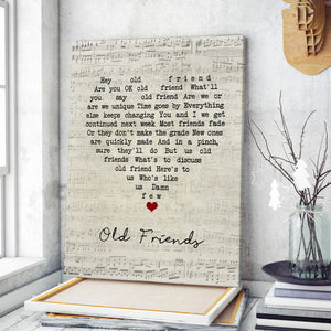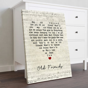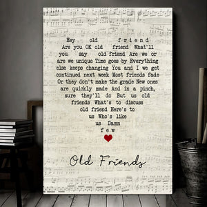 "Old Friends" is a touching song that reflects on the beauty of enduring friendships and the memories created over the years. The lyrics express gratitude for the support, love, and companionship that old friends provide, making this canvas a meaningful tribute to those who have stood by us through thick and thin.