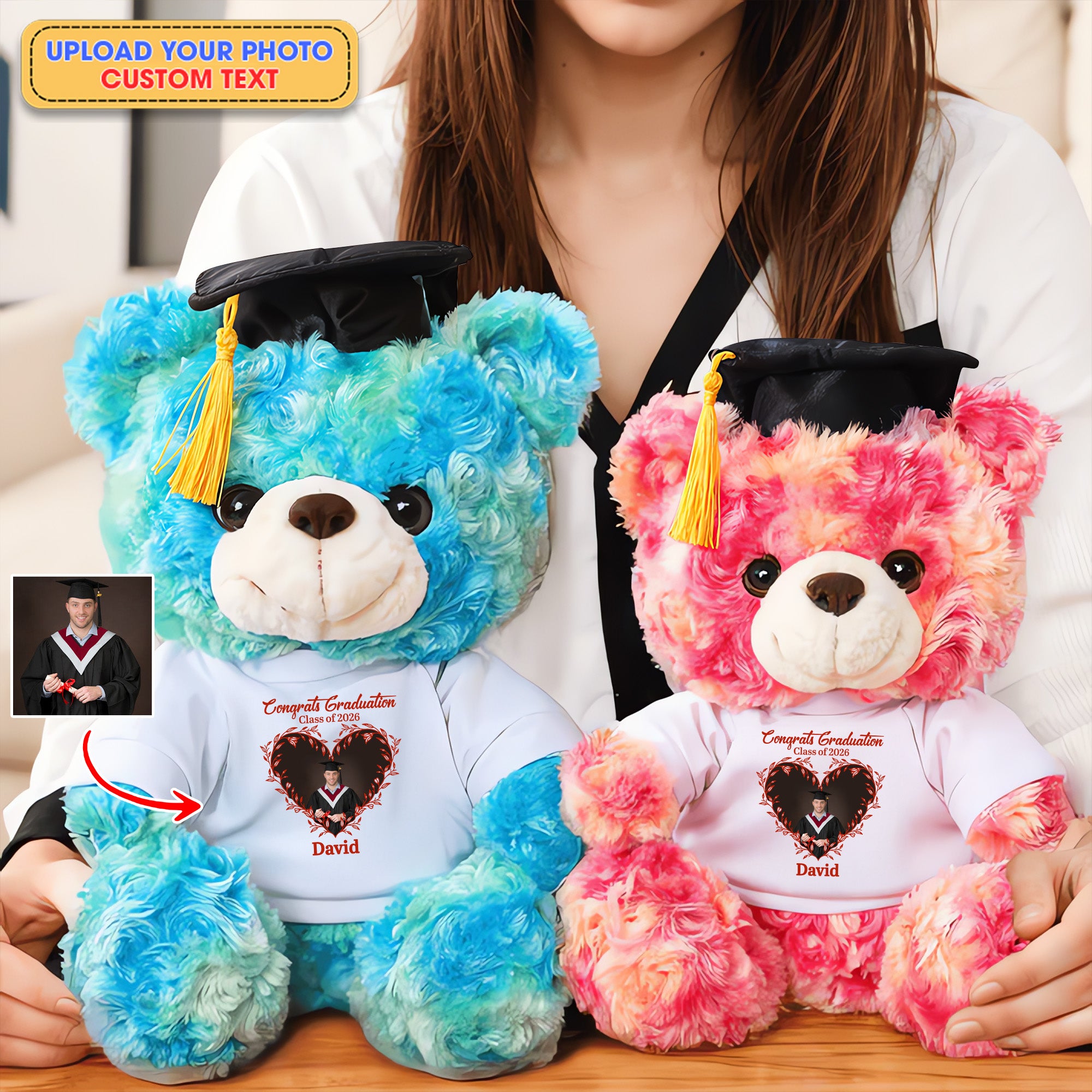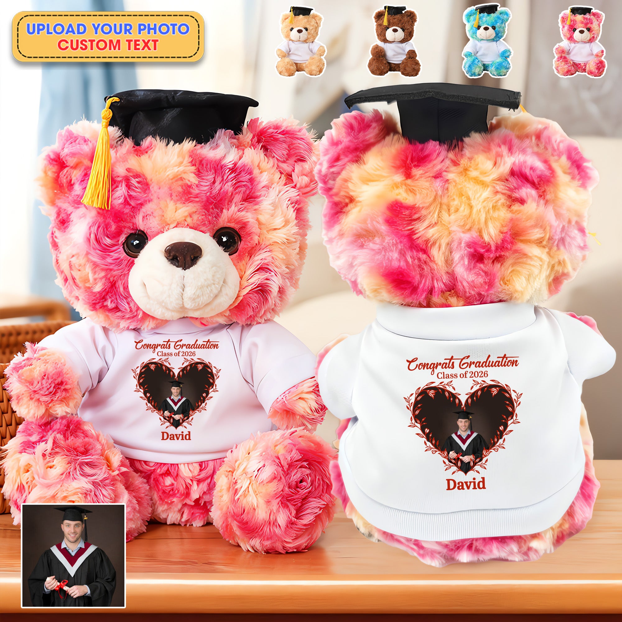 With its plush softness and personalized T-shirt, this bear is more than just a toy, it is a cherished keepsake full of sentiment. The custom graduation bear features a classic graduation cap, symbolizing achievement and success. The customizable T-shirt allows you to add a name, photo, or school name, making it a personalized graduation teddy bear that offers heartfelt encouragement and celebrates the graduate’s journey.