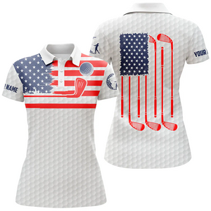 Custom Name American Flag Patriotic White Polo Shirt, Golf Shirt For Women, Ladies Golf Polos