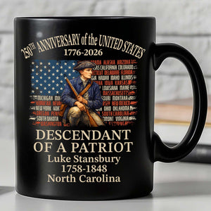 Custom Name Descendant of a Patriot Black Mug, Personalized 250 Years USA 1776–2026 Coffee Mug