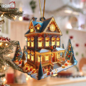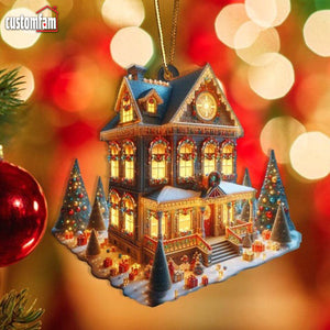 Beautifully detailed to resemble a festive holiday home, this ornament features warmly lit windows, classic wreaths, and tiny gifts surrounding the porch, capturing the charm of a cozy winter evening. With its vibrant decorations and enchanting glow, this ornament adds a nostalgic, festive feel to any Christmas tree or holiday display.