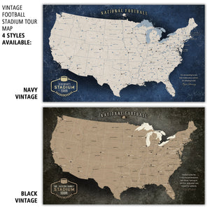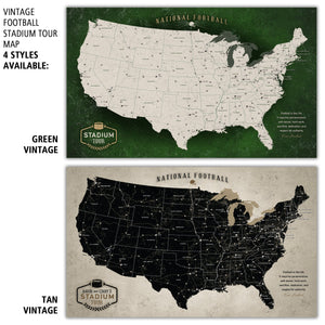 This Vintage Football Stadium Tour Map is the perfect gift for any football fanatic! It's designed to help you track the NFL stadiums you've visited, creating a lifetime of memories. The map features a rustic, vintage style and outlines the locations of all 32 National Football League stadiums, along with the Football Hall of Fame. Each stadium's location is marked with a football icon to represent your visits.