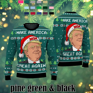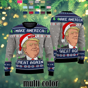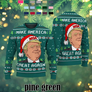 Stand out this holiday season with the Donald J. Trump "Make America Great Again" Christmas sweater! Featuring a bold collage design and festive accents, this unique sweater is perfect for holiday parties, ugly sweater contests, or as a fun gift for political enthusiasts. Made from premium knit fabric, it’s a comfortable and stylish option for both men and women.