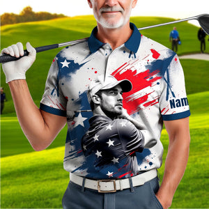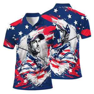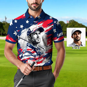 Men's Custom Face Golf Polo Shirt - American Flag Patriotic Gift for Him, Personalized July 4th Shirt, USA Independence Day Golf Tee