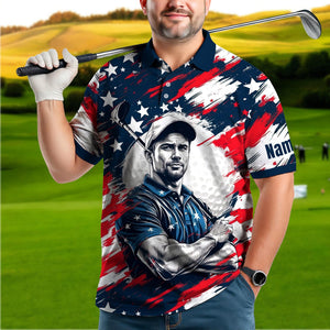 Turn heads on the course and show your patriotic pride with this Custom Face American Flag Golf Polo! Featuring a personalized portrait of your face transformed into a dynamic, illustrated golfer and surrounded by bold red, white, and blue brush strokes, this shirt is a true celebration of both personality and patriotism.