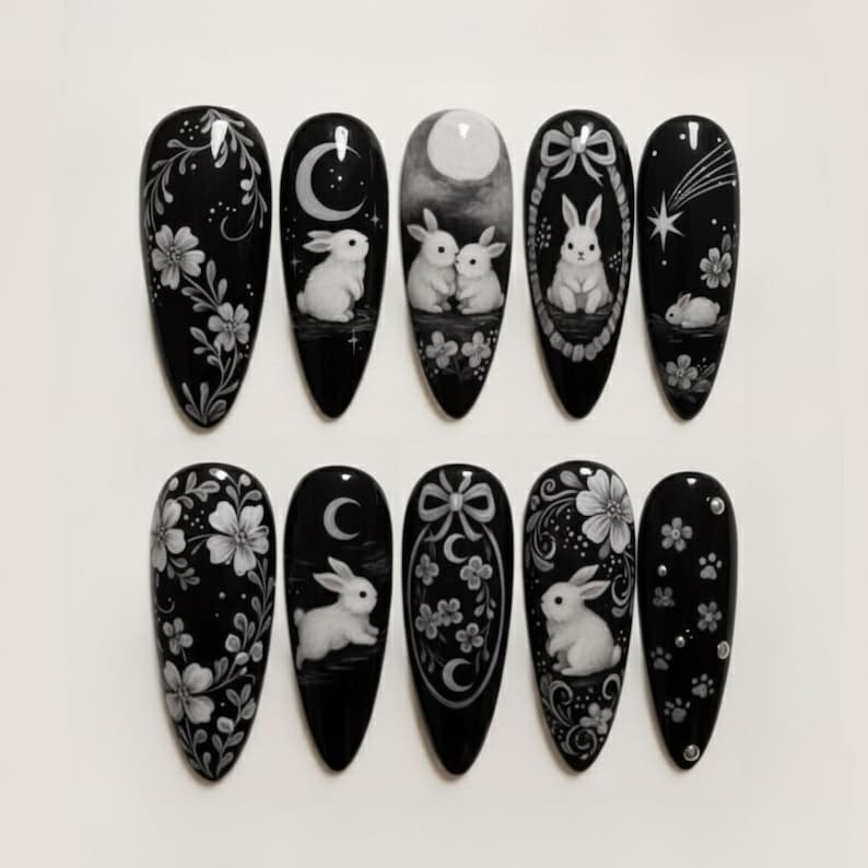 Midnight Moon Bunny Press On Nails, Black White Gothic Rabbit Nail Art, Celestial Floral Handmade