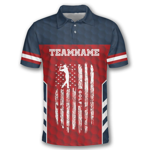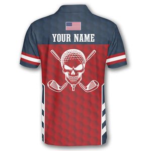 Patriotic Skull Flag Red Blue Golf Polo Shirts for Men, Long Sleeve Golf Shirts, Golf Lovers Gift