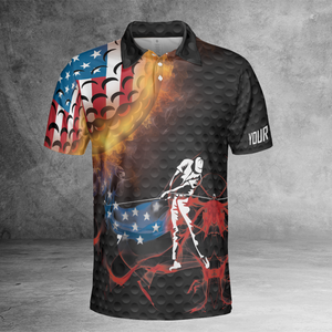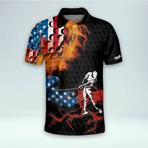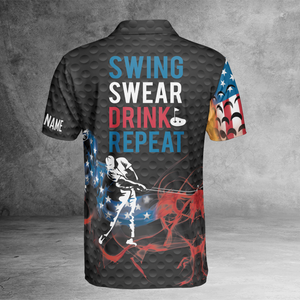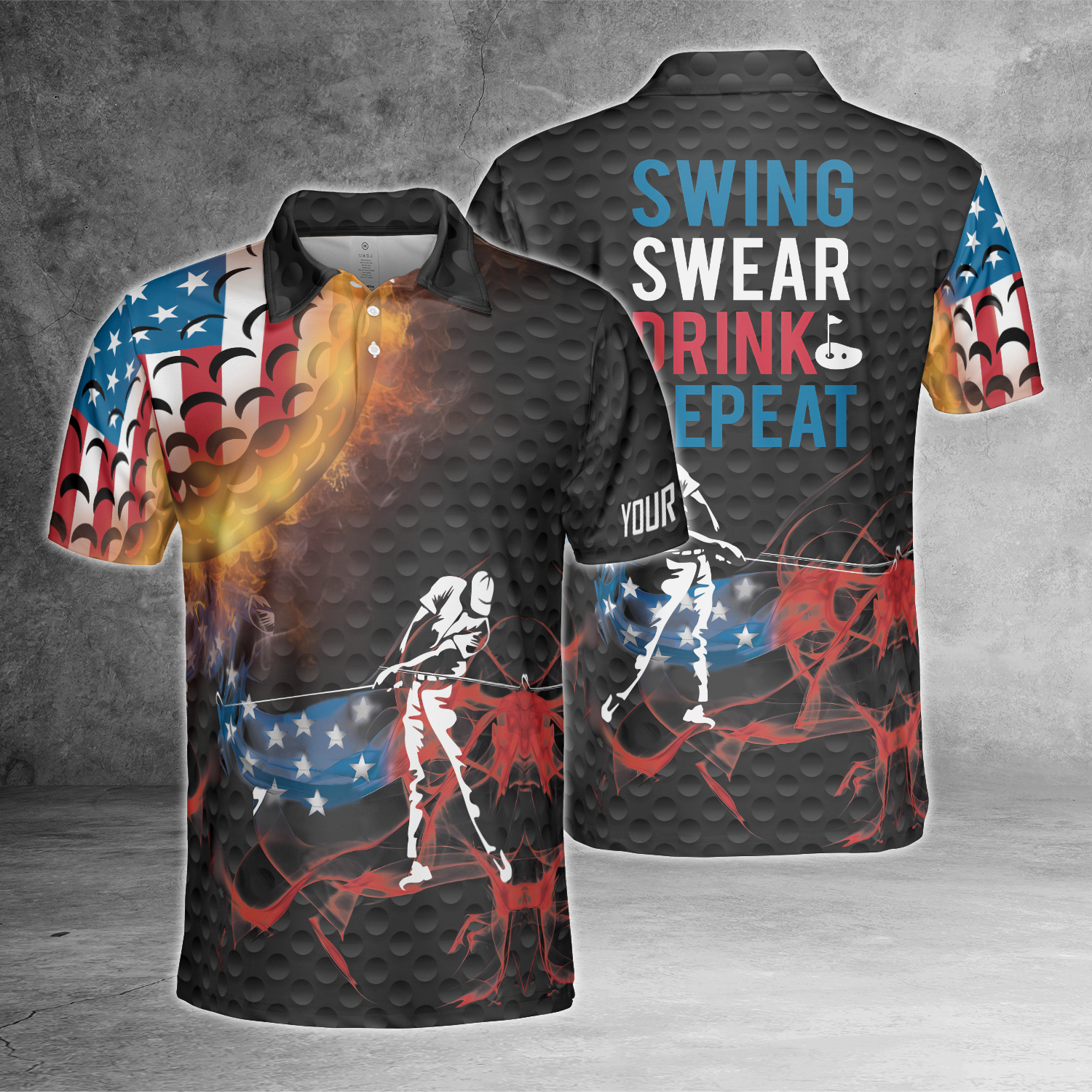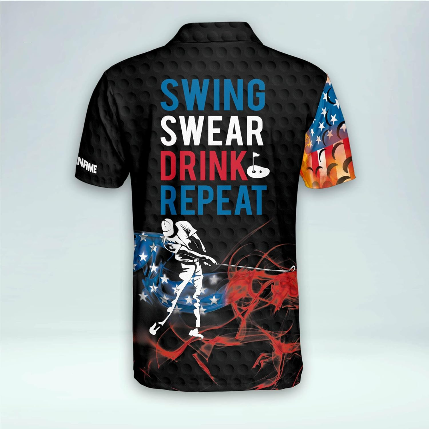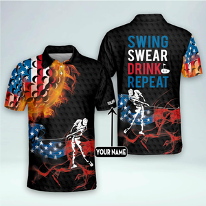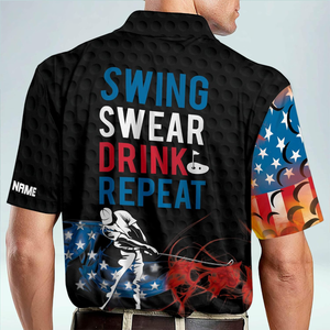 Swing Swear Drink Repeat American Flag Custom Name Golf Polo Shirts, Golf Gift For Men, Golfing Apparel