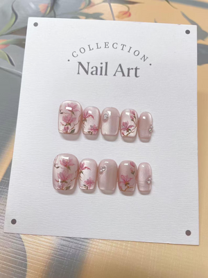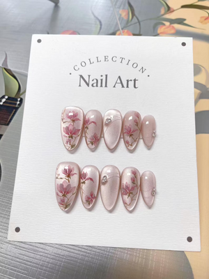 Pink Flowers Cat Eye Press On Nails, Hand Painted Reusable Press On Nails