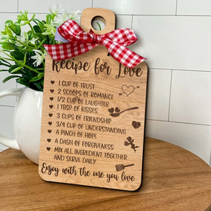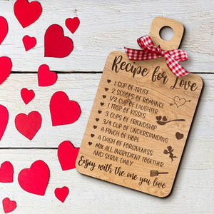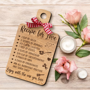 Show your love in the most thoughtful and unique way with our Recipe Cutting Board Wooden Sign. This charming sign is designed to capture the essence of your relationship, featuring a whimsical "Recipe for Love" design that celebrates the ingredients that make your bond so special. Whether you're marking a romantic occasion like Valentine's Day or simply looking for a way to show your affection, this beautifully crafted wooden sign is the perfect gift for your significant other.