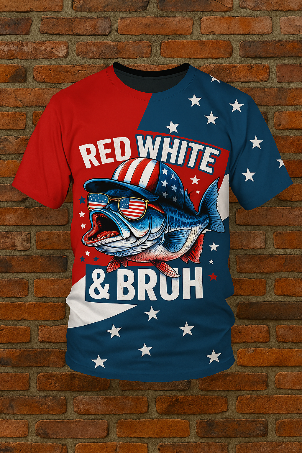Bring the stars, stripes, and a whole lot of attitude with this Red White & Bruh Fishing T-Shirt! Featuring a bold bass wearing flag shades and a USA cap, this shirt screams freedom, fishing, and pure American fun. The striking red, white, and blue design with scattered stars is perfect for Independence Day, BBQ parties, or any day spent on the lake.
