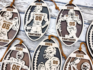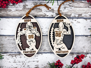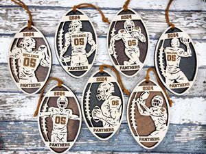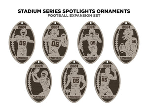 Introducing the Stadium Series Spotlight Football Set that features 7 Ornament Designs, This collection showcases more dynamic designs of a male athlete, captured in the perfect poses and framed by a football shape for a striking effect. Each ornament design celebrates the passion and