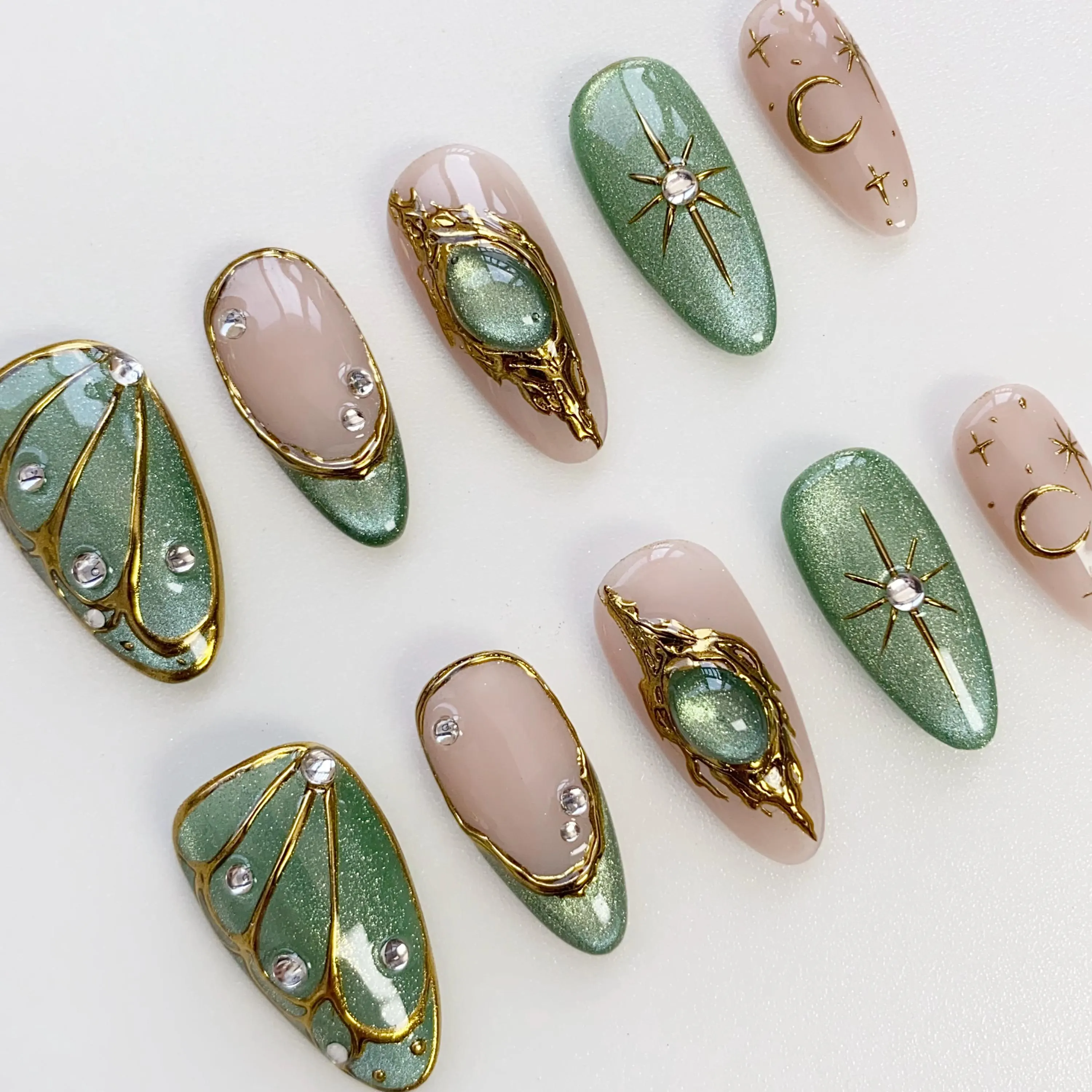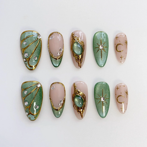 Summer Cat Eye Green Press On Nails, 3D Gold Chrome Nail, Reusable Press On Nails