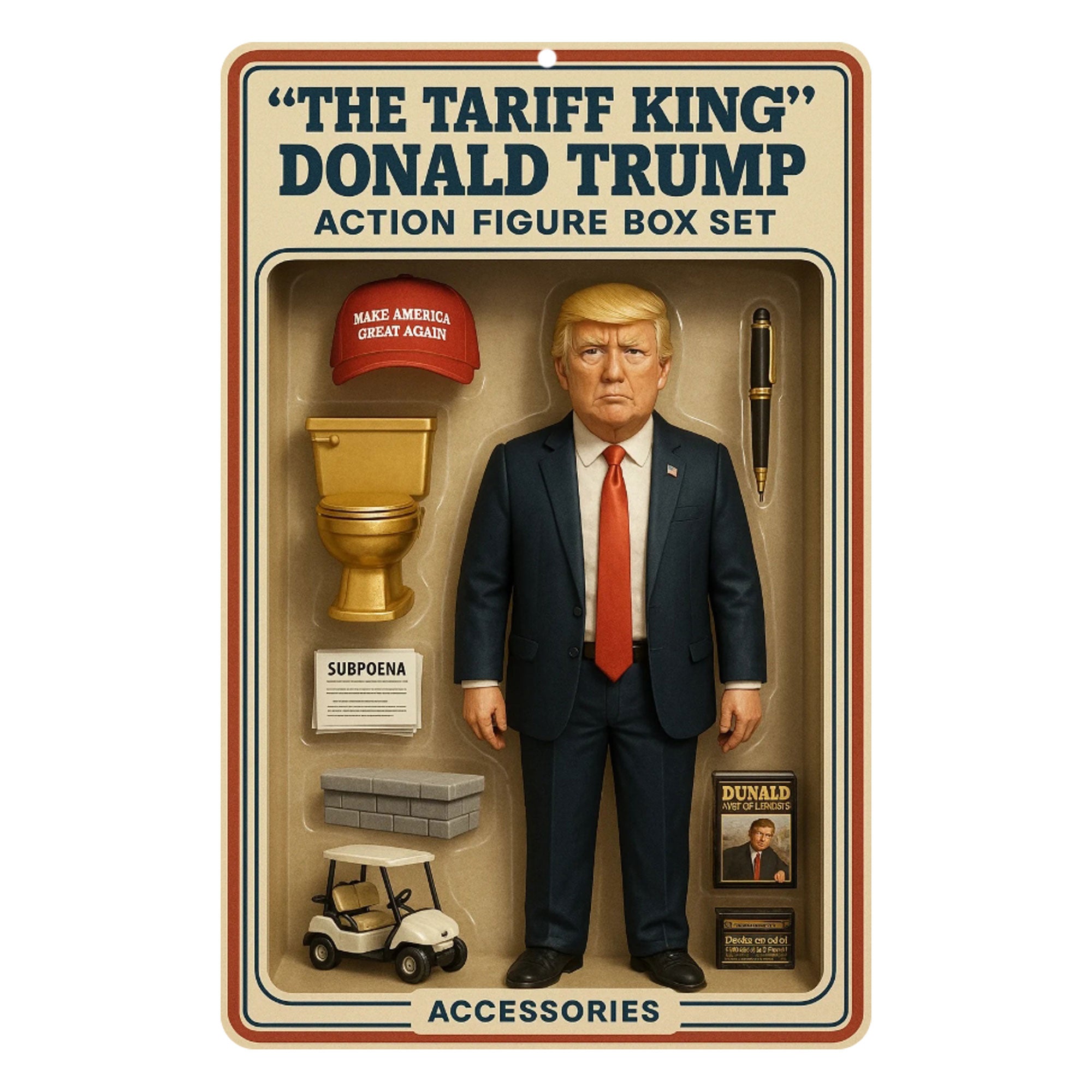 ✔ Creative design with Donald Trump image in the style of a classic toy box.