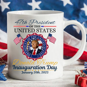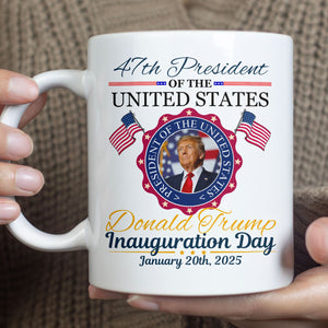 Celebrate a historic moment with this commemorative mug! Featuring a striking photo of Donald J. Trump, this design honors his tenure as the 47th President of the United States. Above the photo, the bold text proudly reads “47th President of the United States,” while below, his name and the words “Inauguration Day” mark this monumental occasion. Made from premium ceramic, this mug is perfect for enjoying your favorite beverages while commemorating this iconic day in American history. Whether you're a collector, a supporter, or simply looking for a unique gift, this mug makes a meaningful addition to any home or office.