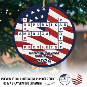 This festive and patriotic 2-layer wooden ornament is the perfect way to show your support for Trump in the 2024 election while celebrating the holiday season. Crafted from high-quality wood, the ornament features a bold "Trump2024" design with the slogan "Make Election Great Again." Its unique two-layer construction adds depth and durability, making it a standout piece for your Christmas tree or as a keepsake for supporters. Ideal for political enthusiasts and those who want to bring a touch of election spirit to their holiday decor.