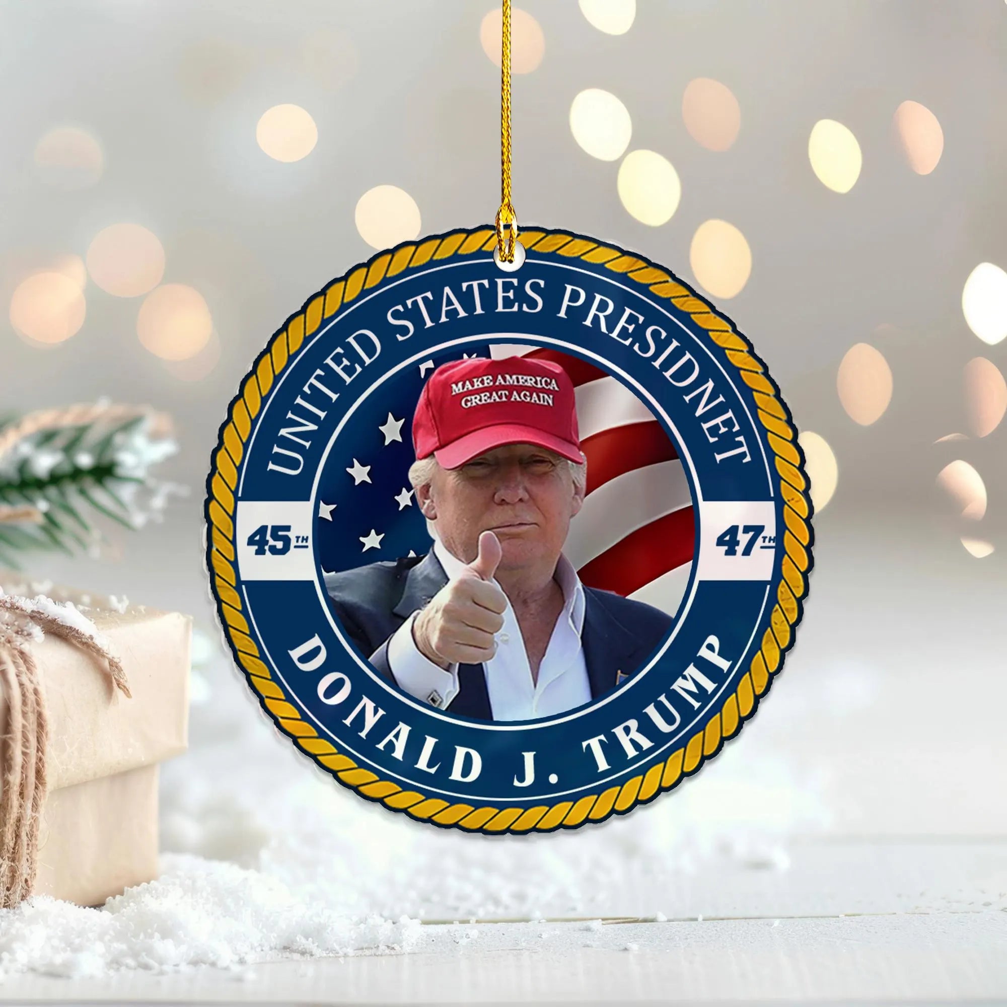 Show your support for the 45th and 47th President of the United States with this stunning Trump 2024 ornament! Featuring a presidential seal-inspired design, this patriotic decoration adds elegance and pride to your holiday season.