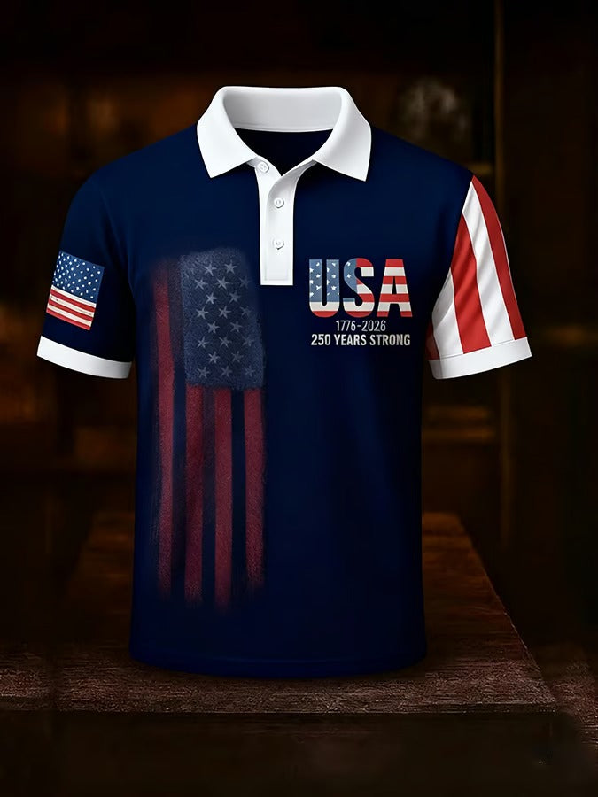 USA 1776-2026 250 Years Strong American Flag Pattern Navy Retro Polo Shirts, 4th Of July Polo
