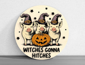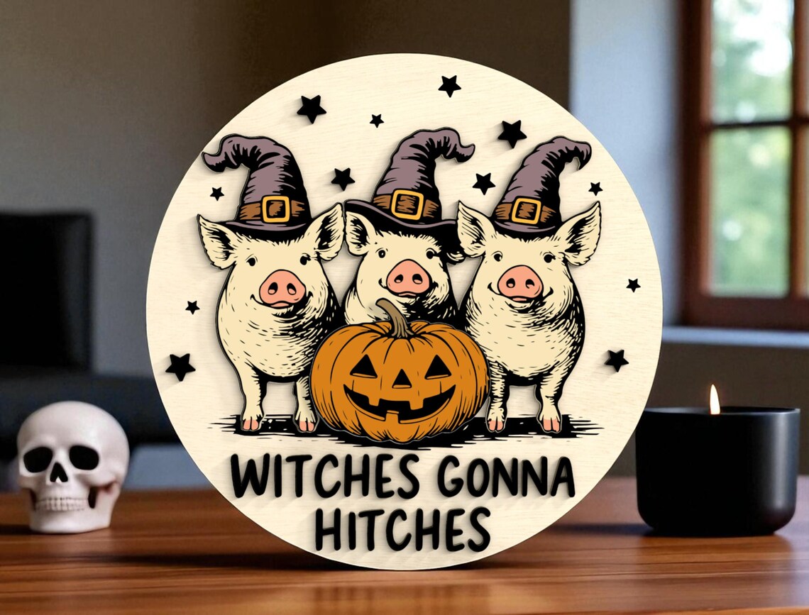 Wiches Gonna Hitches Funny Pigs Wood Signs Outdoor, Porch Signs, Halloween Porch Decor