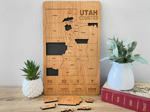 This Utah Counties Wooden Puzzle Display maps out each of the 29 counties in Utah. Each of the 29 county pieces are removable, with a solid black backer behind them. With Utah state facts engraved under the puzzle map, the interactive wooden map of Utah serves as an elegant display in any home or classroom!