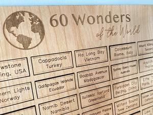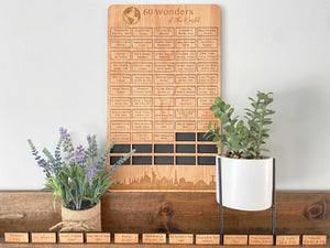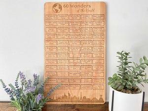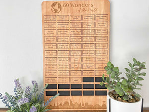 This 60 Wonders of the World Travel Bucket List Board is the perfect gift for anyone who loves to travel and explore the world! The World Wonders Travel Bucket List features the top 60 wonders of the world. From the Eiffel Tower in France, or the Terracotta Warriors in China, or Mount Everest in Nepal, it includes 60 of the world’s greatest landmarks! The board gives you a beautiful way to track which world wonders you’ve visited, and which ones you still need to get to. It also serves as an elegant home decor piece that can proudly be displayed in your home, and will be sure to spark intriguing conversations with any guests! Whether it’s a wedding gift, Christmas gift, birthday gift, or anniversary gift for the wanderlust, travel lover in your life, it’s sure to be an amazing and rewarding way to track your world travel adventures!