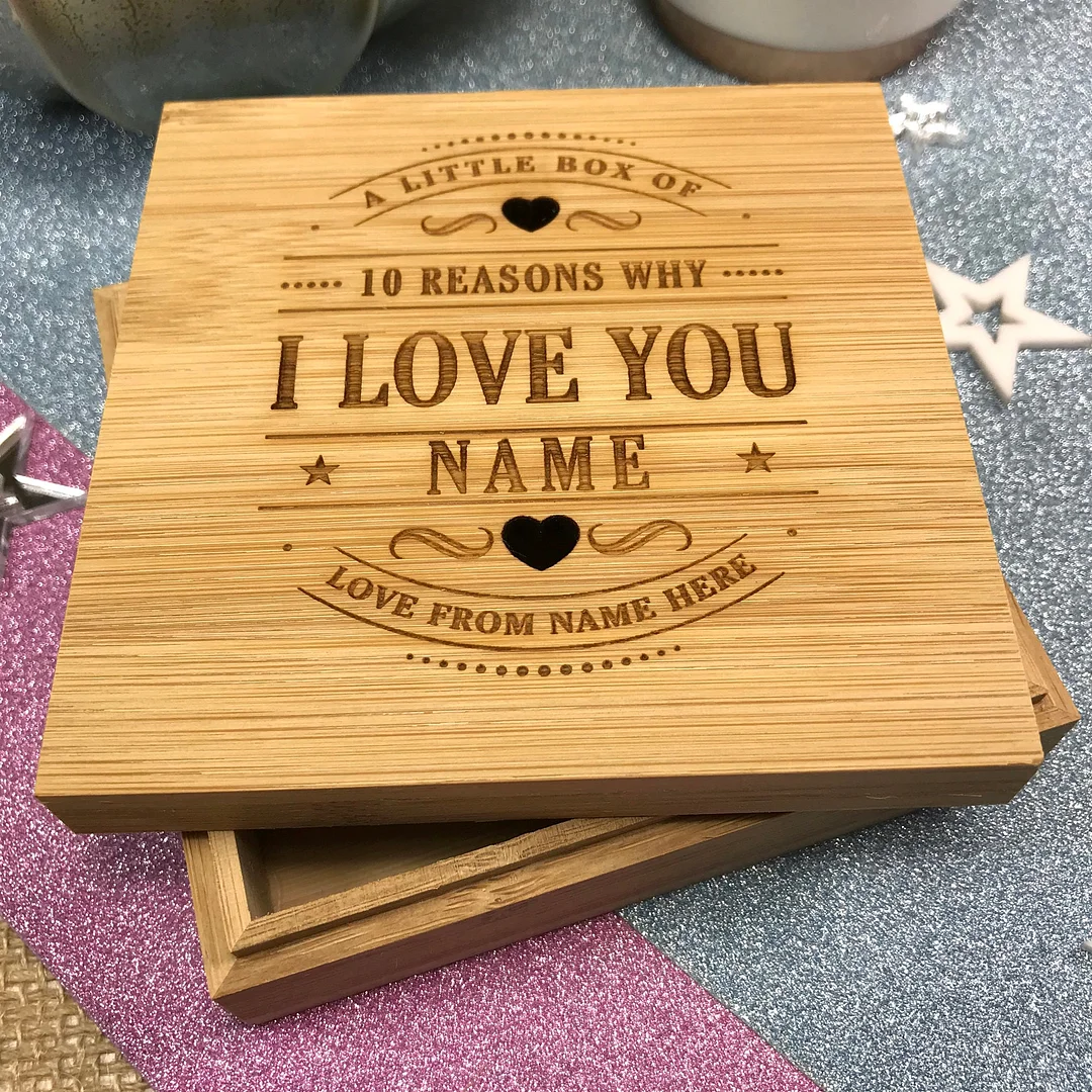 Celebrate your unique love story with the 10 Reasons Why I Love You Wood Box. This personalized keepsake box is the perfect way to express your love and appreciation for your partner, featuring ten heartfelt reasons why you adore them. Ideal for Valentine’s Day, anniversaries, or any special occasion, this custom wood box offers a beautiful and lasting way to show your partner how much they mean to you.
