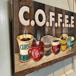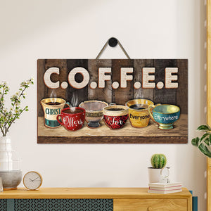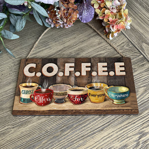 Elevate the warmth of your home with this beautiful Personalized C.O.F.F.E.E. Wooden Sign, designed to bring both your love for coffee and your faith into a single, heartwarming piece of decor. This rustic sign creatively spells out "C.O.F.F.E.E" with each letter represented by a different, uniquely styled coffee cup, each adorned with a special word that together form a powerful message: