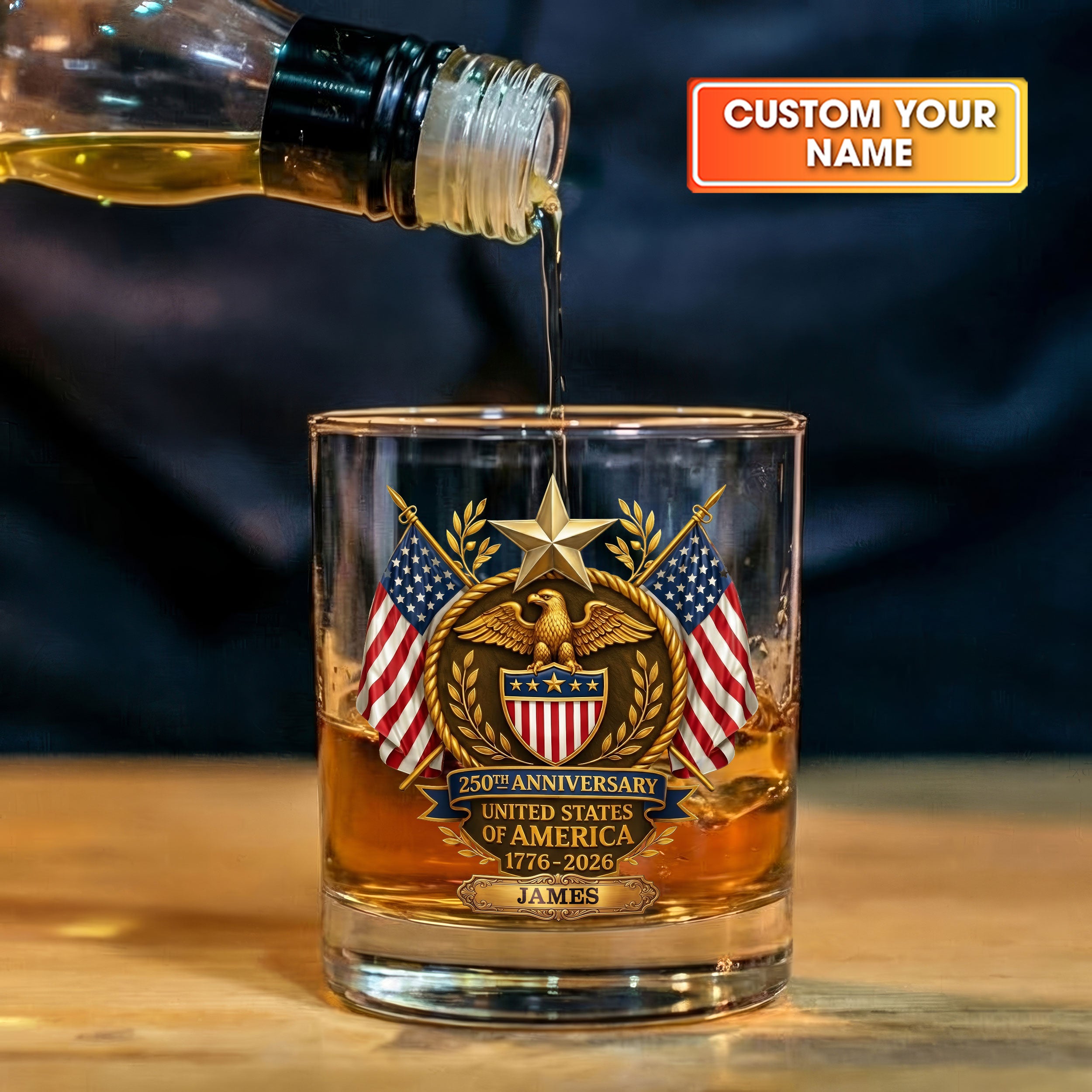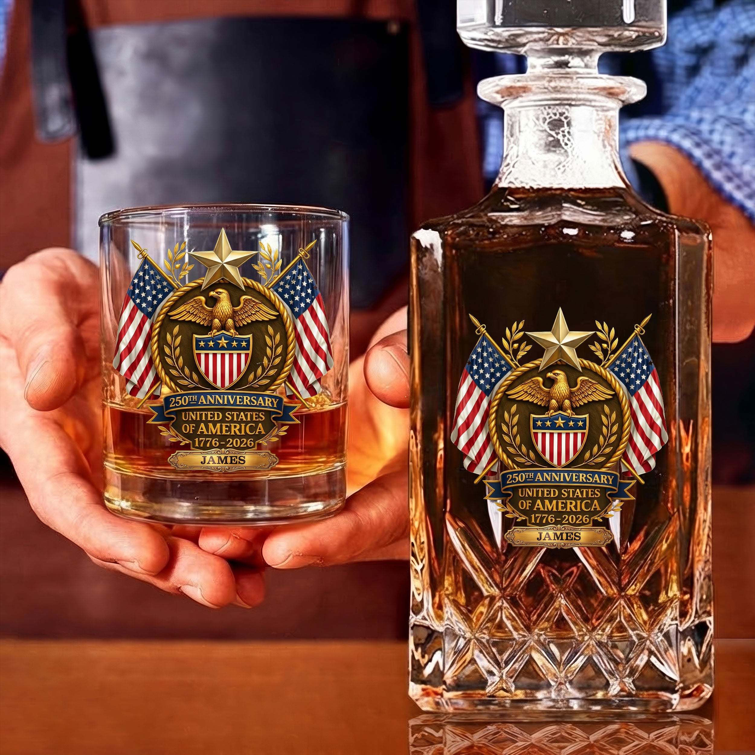 250th Anniversary Eagle Shield US Flag Stars Whiskey Decanter Set, America Patriot Whiskey Glasses