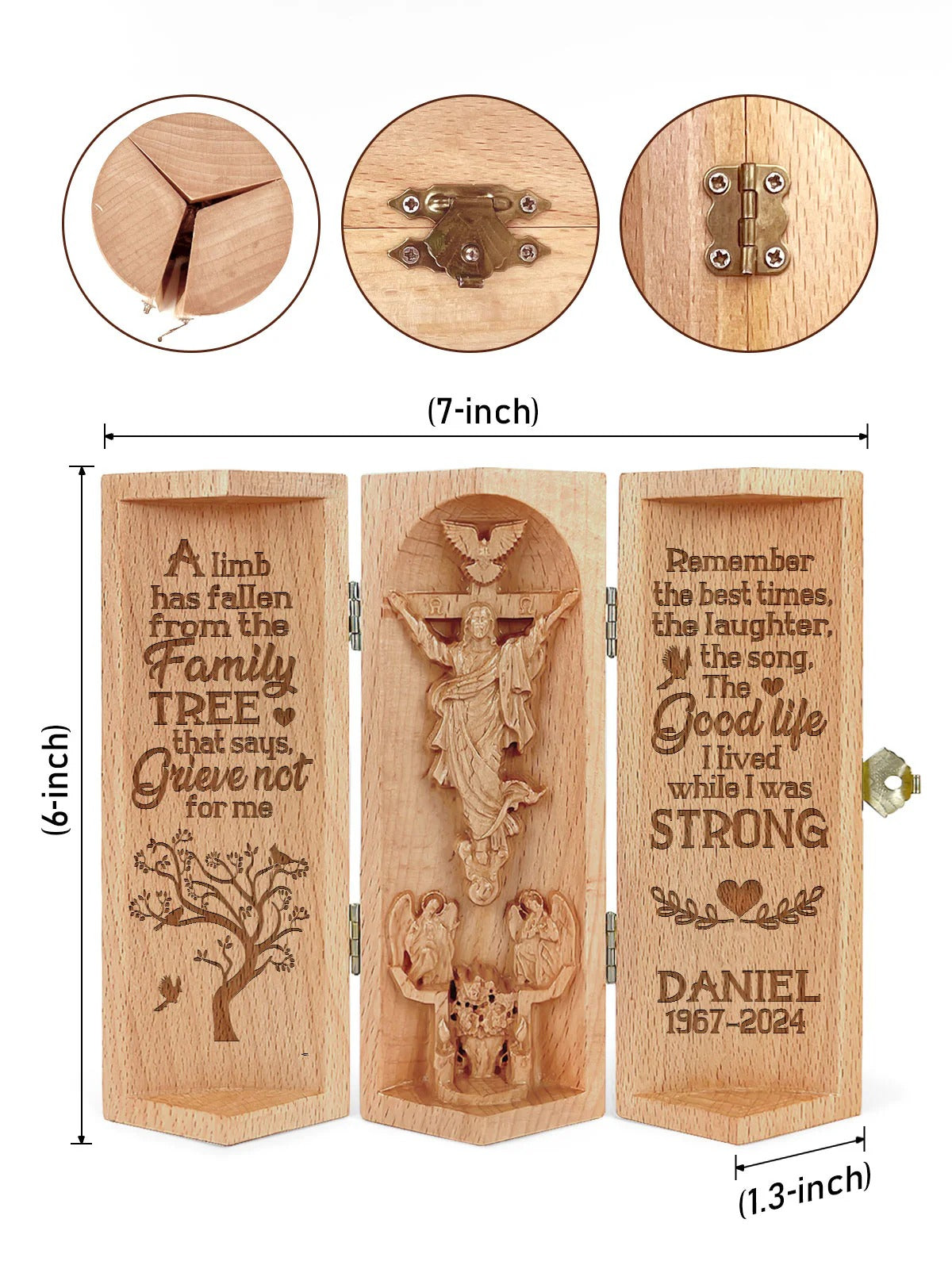 This intricately crafted wooden sculpture is a heartfelt tribute to faith and family. The product features a beautifully designed cylindrical wooden container that opens to reveal a 3D depiction of Jesus Christ on the cross, surrounded by angels and a dove symbolizing the Holy Spirit.