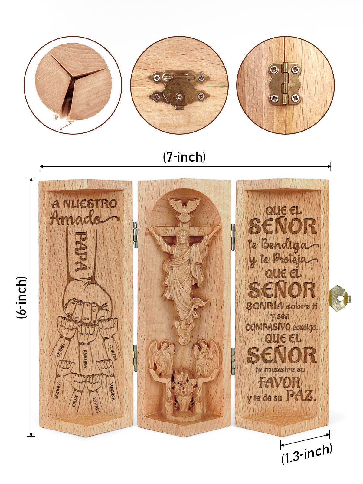 This intricately crafted wooden sculpture is a heartfelt tribute to faith and family. The product features a beautifully designed cylindrical wooden container that opens to reveal a 3D depiction of Jesus Christ on the cross, surrounded by angels and a dove symbolizing the Holy Spirit.