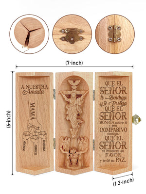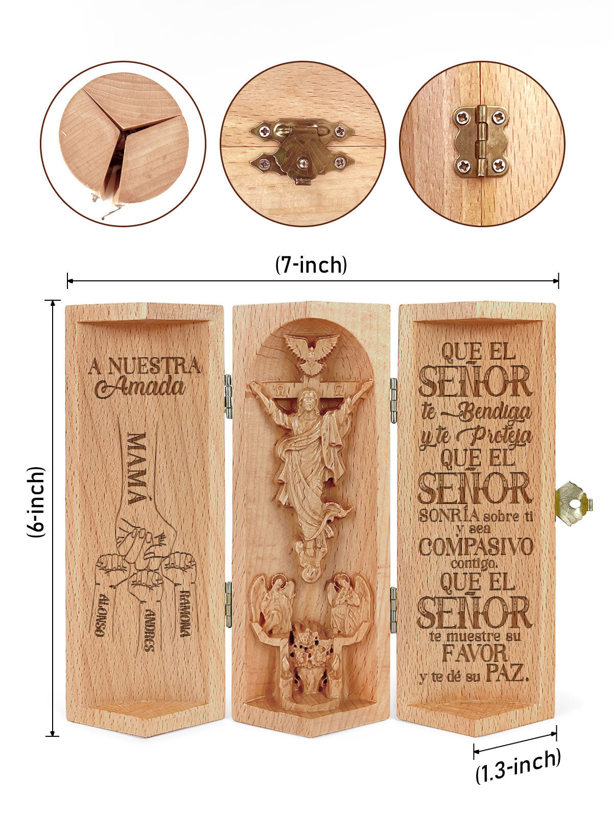 This intricately crafted wooden sculpture is a heartfelt tribute to faith and family. The product features a beautifully designed cylindrical wooden container that opens to reveal a 3D depiction of Jesus Christ on the cross, surrounded by angels and a dove symbolizing the Holy Spirit.
