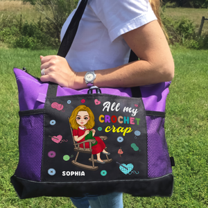 The tote features a delightful design with the quote "All My Crochet Crap" capturing the spirit of yarn lovers everywhere. The bag also includes multiple pockets and compartments to keep your supplies organized and easily accessible.