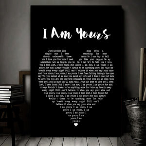 "I Am Yours" is a song that celebrates love, devotion, and the unbreakable bond between two people. The lyrics express deep feelings of commitment and belonging, making it a favorite choice for romantic moments and milestones. The black heart design symbolizes the strength and permanence of love, while the flowing script font captures the tenderness and warmth of the song’s message.
