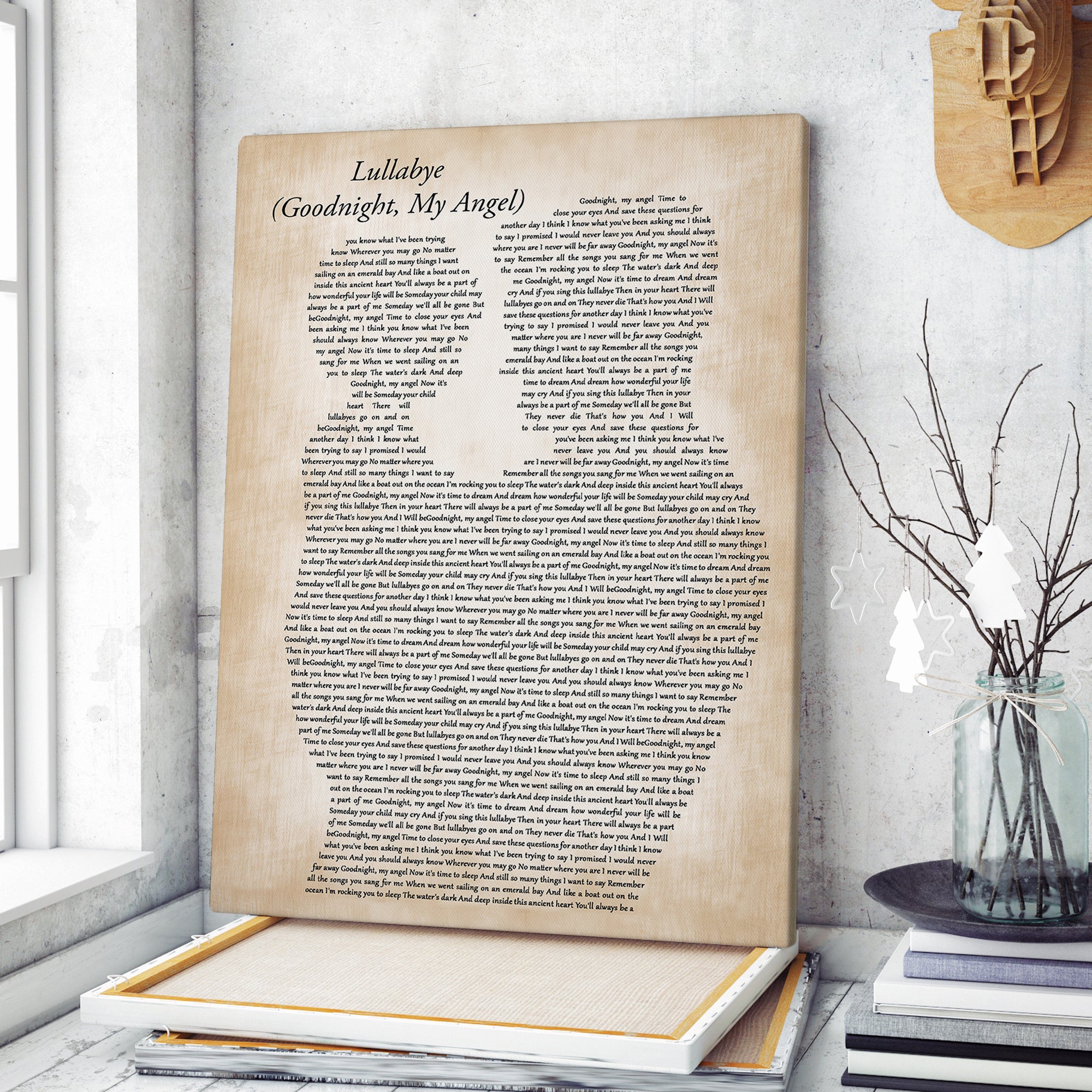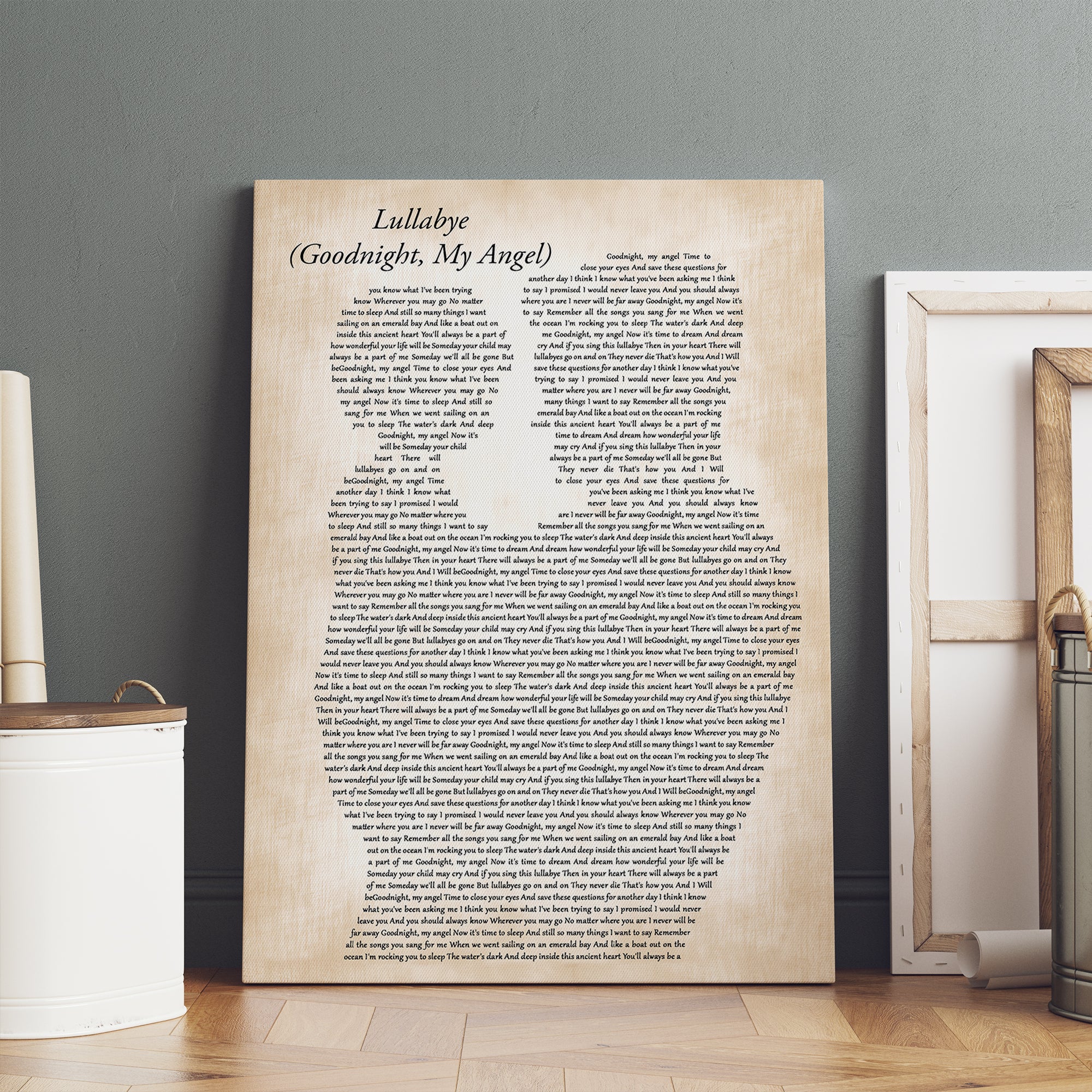 Capture the deep emotional connection between a parent and child with this beautifully designed art print featuring lyrics from Billy Joel’s tender ballad, "Lullabye (Goodnight, My Angel)." This piece celebrates the bond between father and child, making it the perfect addition to a nursery, child’s room, or family space....