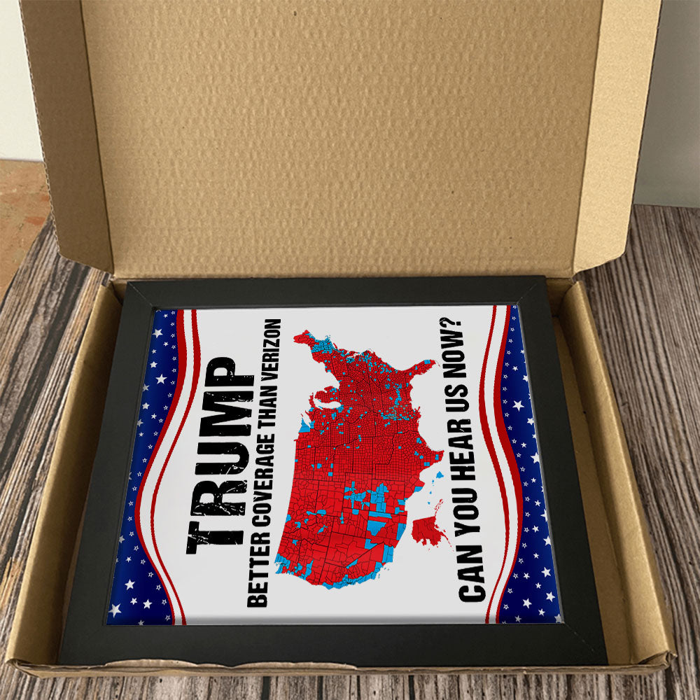 Show off your love for America and support for our President with this Trump Picture Frame. Featuring a map of the US and the iconic phrase "Can You Hear Us Now", this makes the perfect gift for any Trump supporter. Display your patriotism proudly with this unique and stylish frame.
