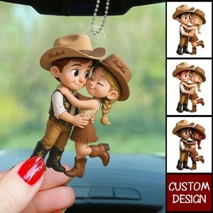 Cartoon Style Countryside Couple Cowboy Cowgirl Personalized Car Ornament, Couple Valentines Gifts, Anniversary Gifts