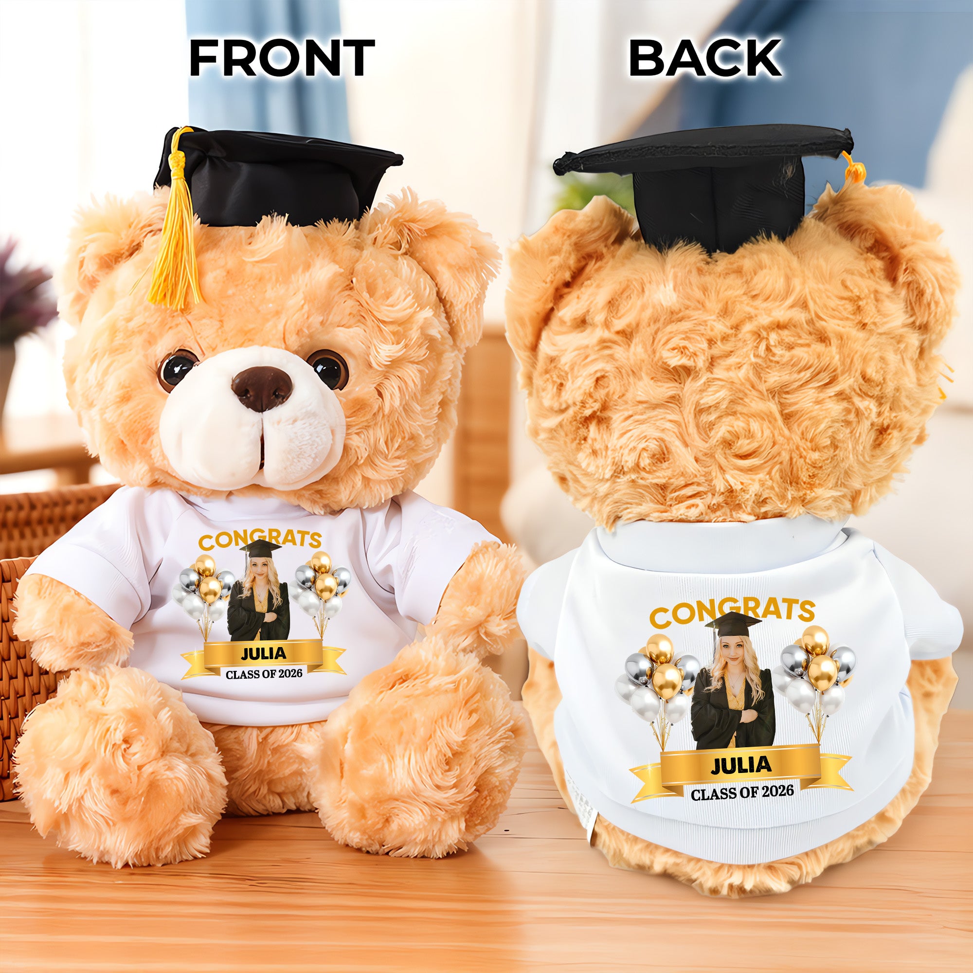 With its plush softness and personalized T-shirt, this bear is more than just a toy, it is a cherished keepsake full of sentiment. The custom graduation bear features a classic graduation cap, symbolizing achievement and success. The customizable T-shirt allows you to add a name, photo, or school name, making it a personalized graduation teddy bear that offers heartfelt encouragement and celebrates the graduate’s journey.