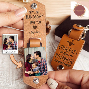 Congrats On Being My Boyfriend Personalized Photo Leather Keychain, Gift for Couple