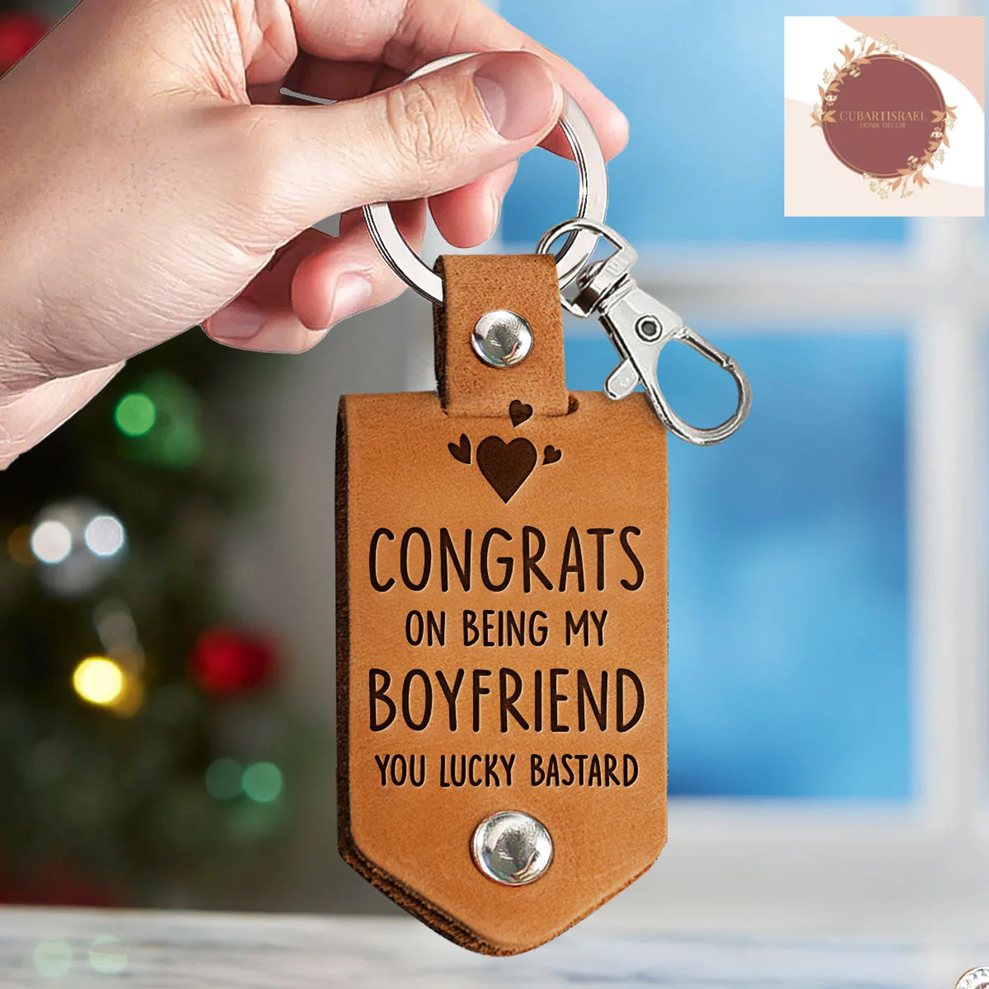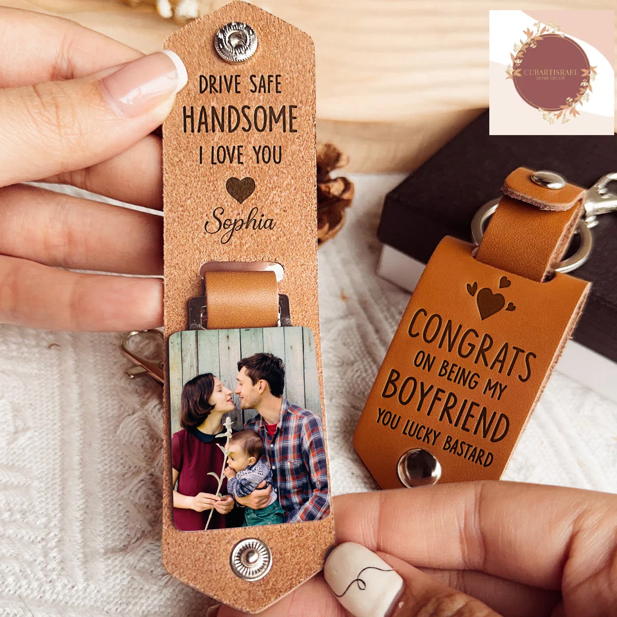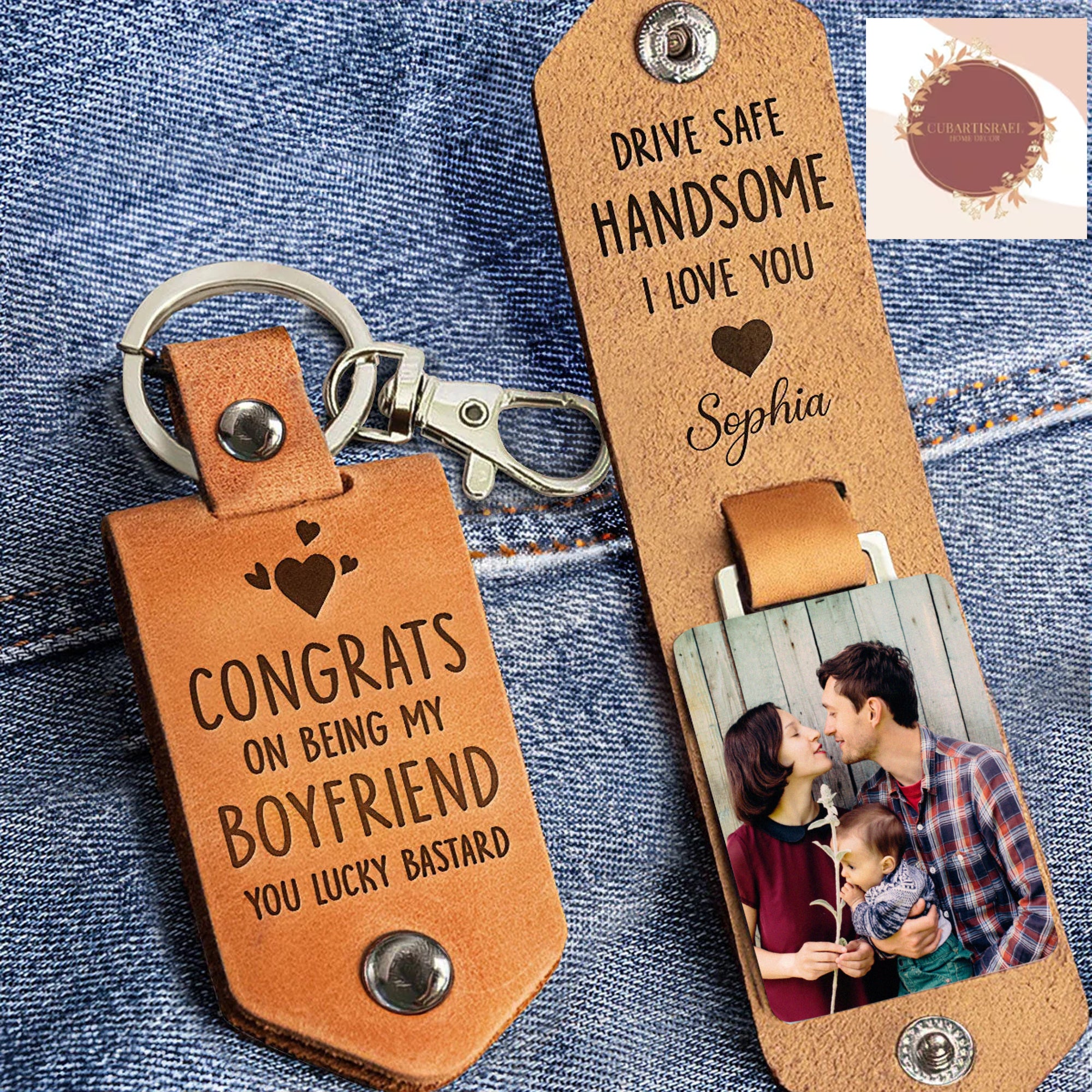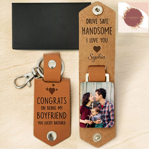 Express your love with the Congrats On Being My Boyfriend You Lucky Bastard - Personalized Leather Photo Keychain. This unique keychain serves as a heartfelt reminder of your affection, making it an ideal birthday or anniversary gift for your boyfriend or husband. Crafted from premium leather, it exudes both elegance and sentimentality. The keychain can be customized with a photo that holds special memories, adding a personal touch to this thoughtful present. Capture and carry your cherished moments wherever you go, symbolizing the enduring bond between you and your loved one. Gift this personalized keychain to make every day a reminder of your love.