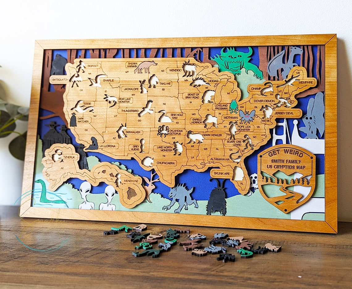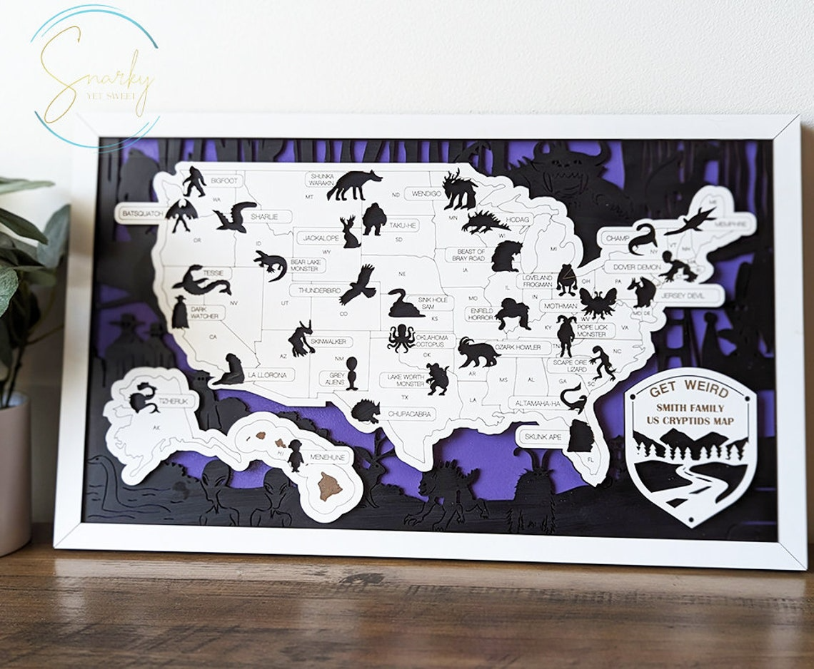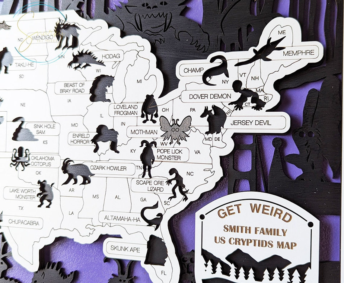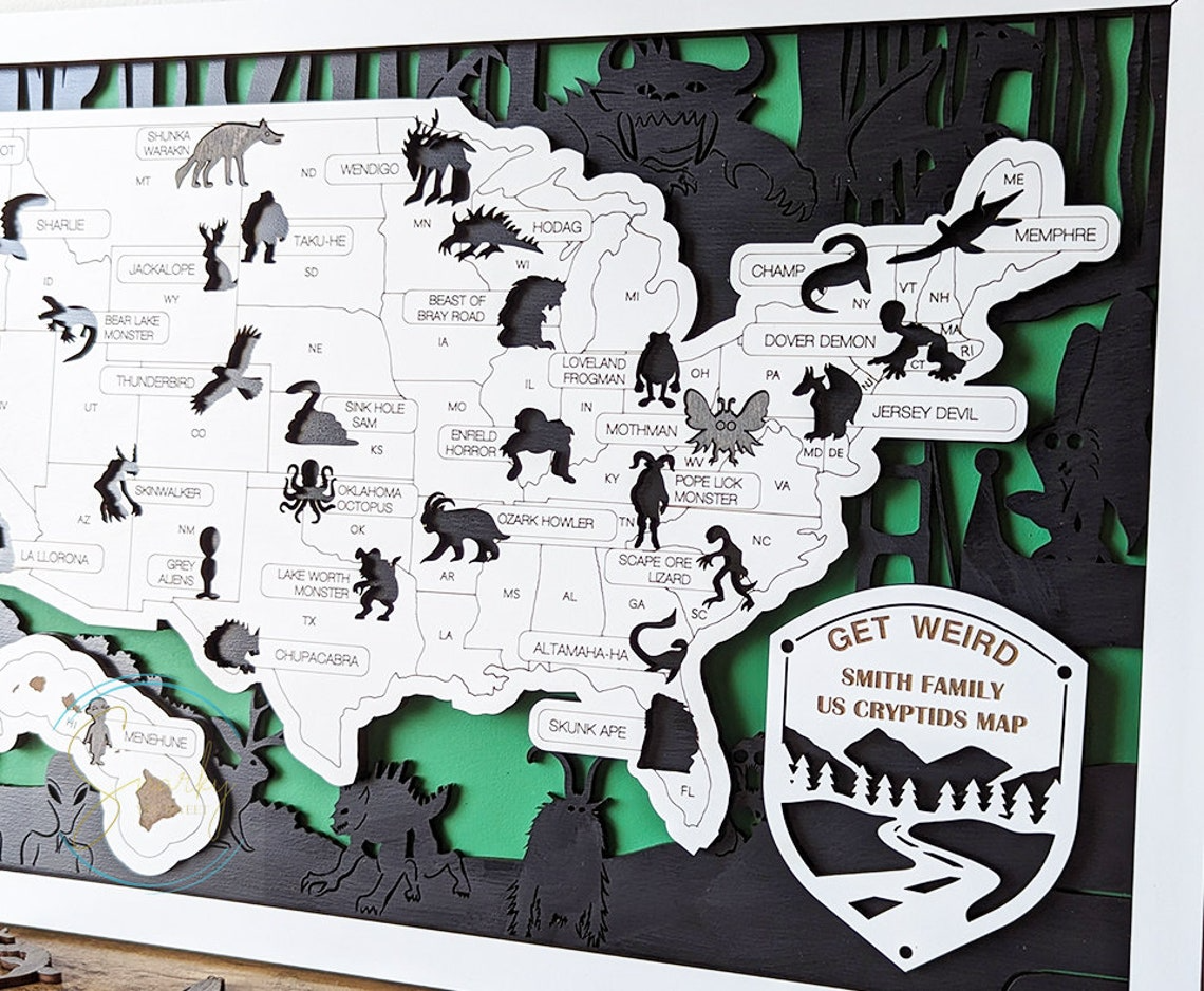 Cryptids Map – Map of Cryptids in the USA & Cryptozoology Wooden Tracker