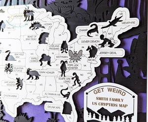Unveil the mysterious world of cryptids with our Cryptids Map, a captivating map that showcases the locations of legendary creatures and monsters across the United States. From Bigfoot to the Mothman, this unique map highlights well-known and lesser-known cryptids, making it a must-have for fans of cryptozoology, mystery lovers, and those fascinated by folklore. The Cryptozoology Wooden Map Tracker adds an extra dimension to this experience, allowing you to track your exploration of cryptid sightings and encounters, all while enjoying the artistry of a finely crafted map.
