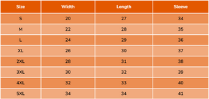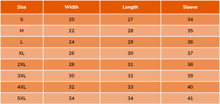 | Size | Chest (Front Only) | Body Length | Sleeve Length |