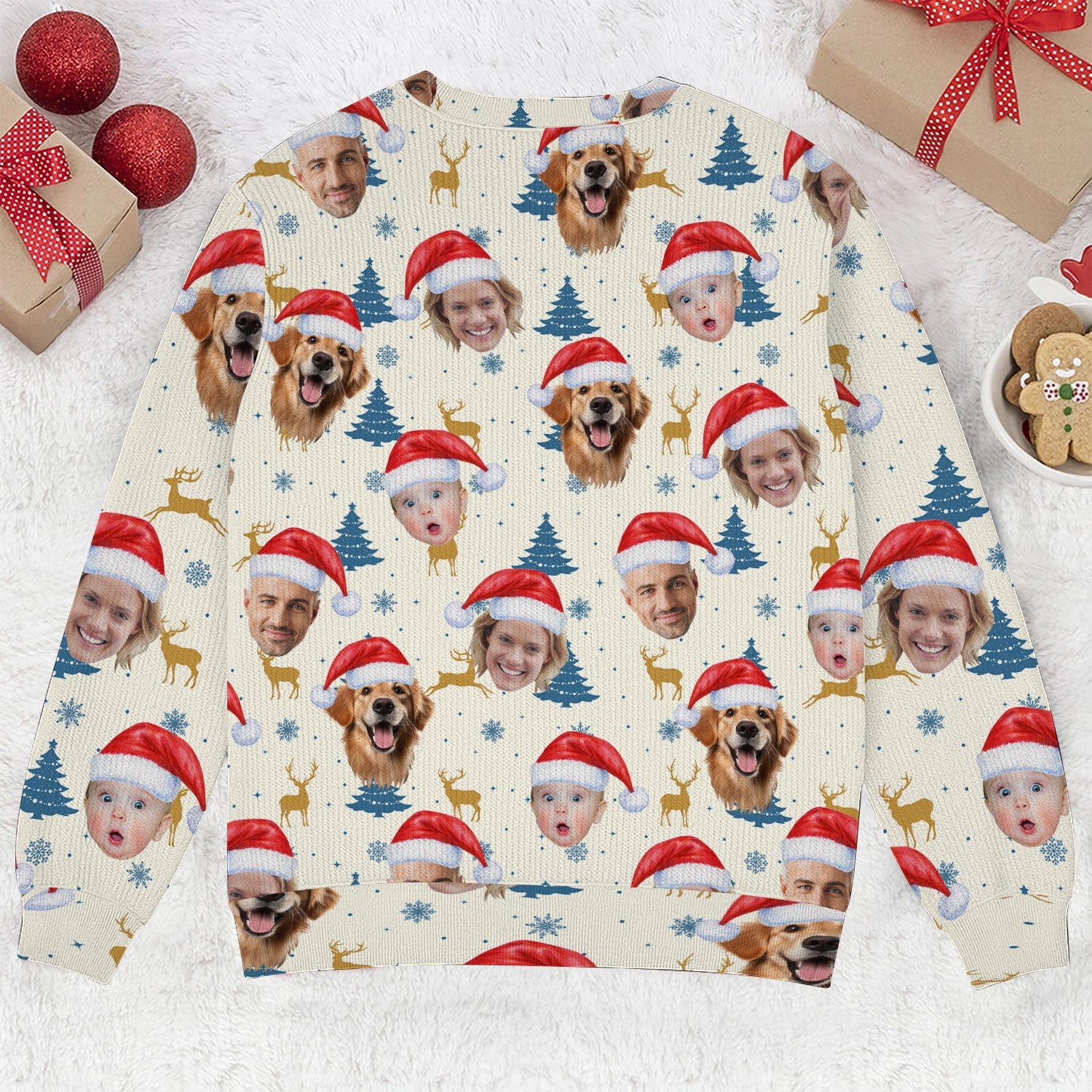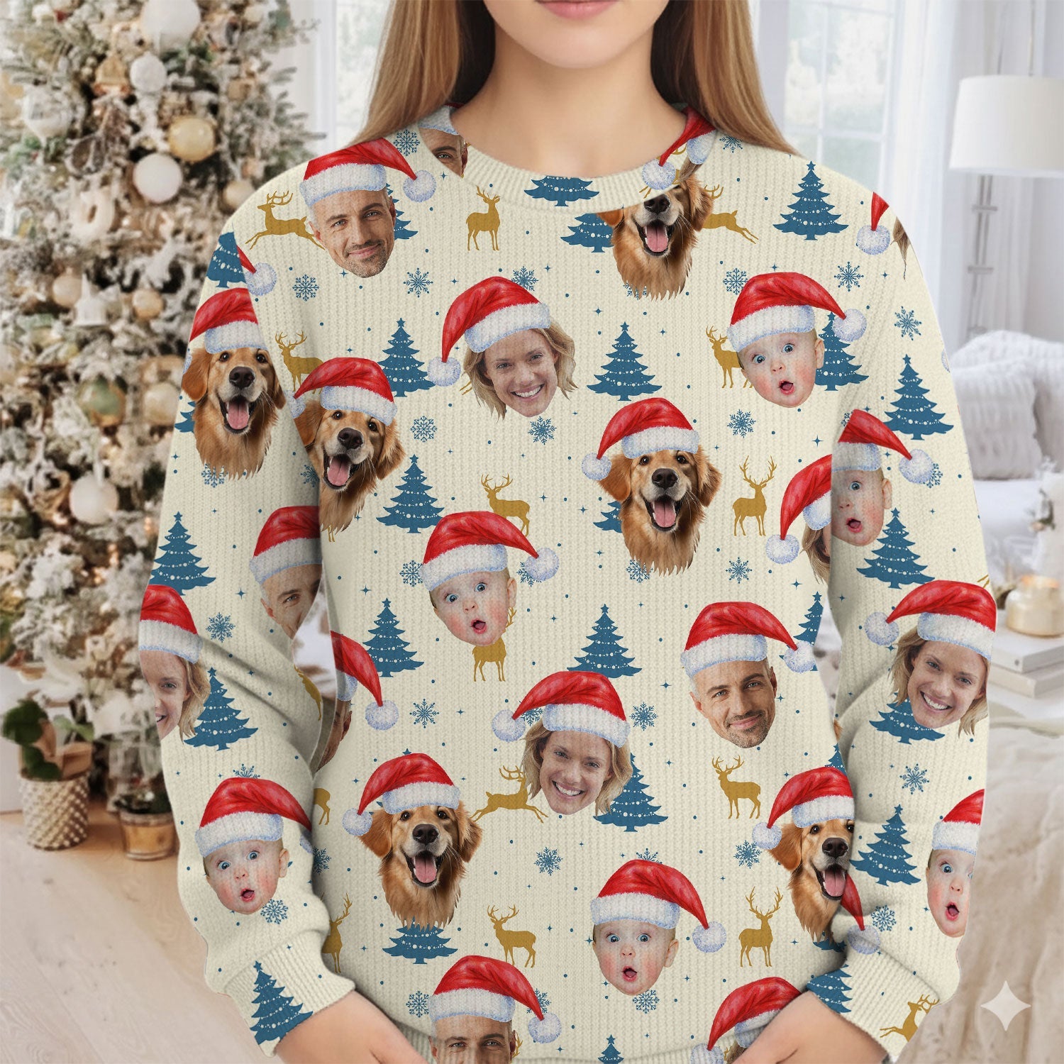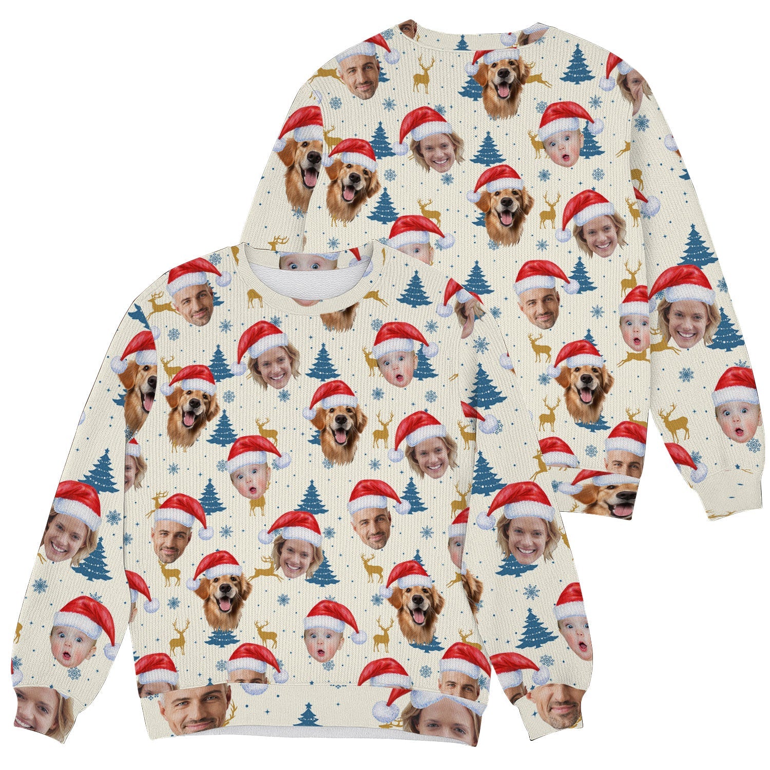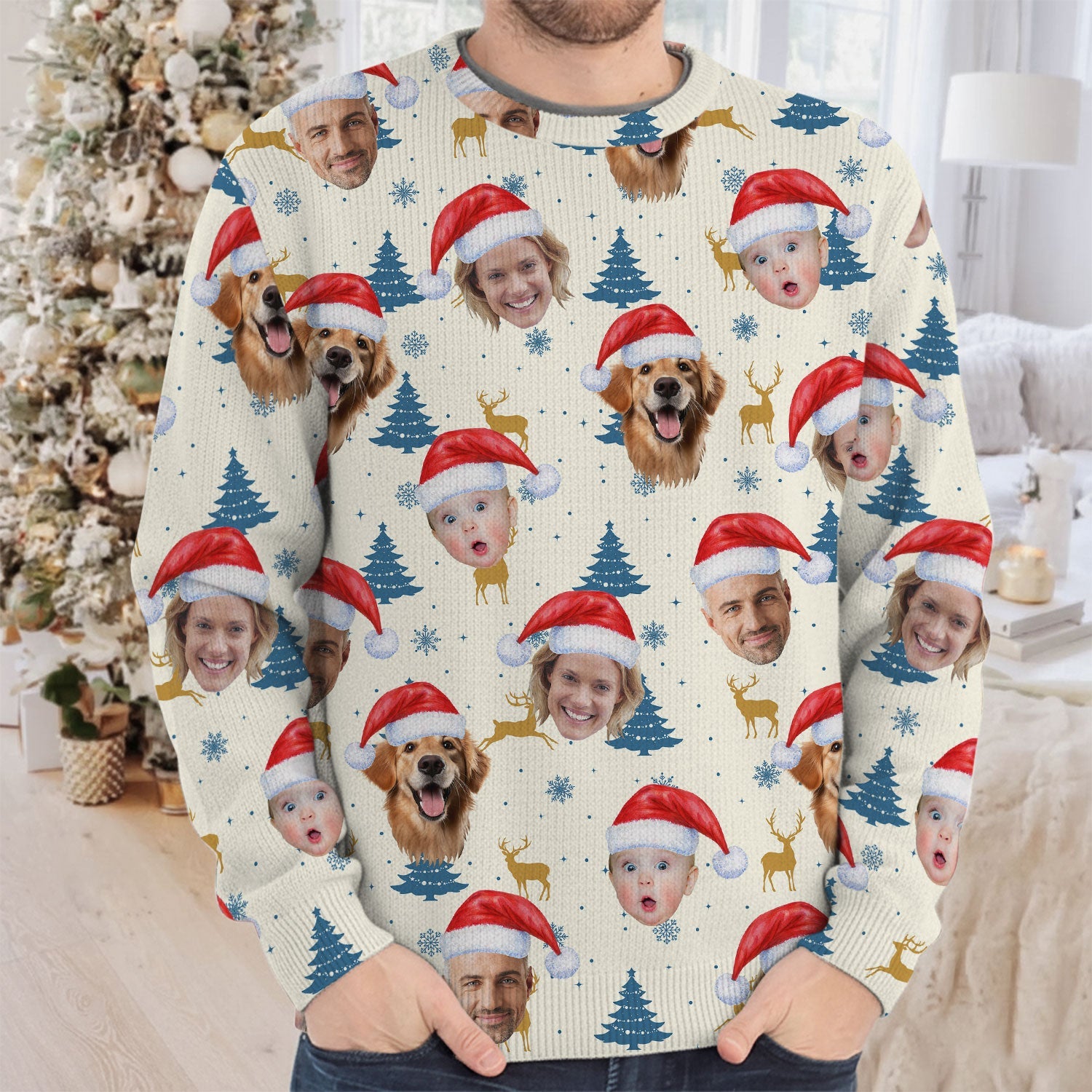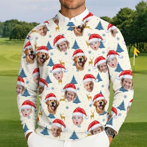Custom Face Pine Tree Pattern Beige And Navy Golf Ugly Sweater, Christmas Golf Shirt, Golf Sweater