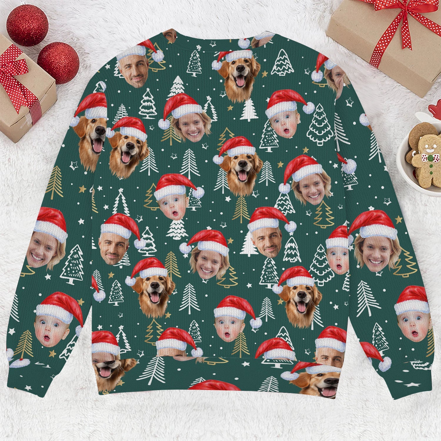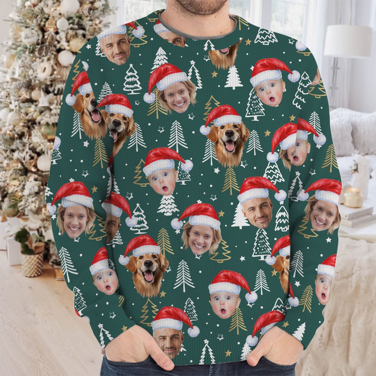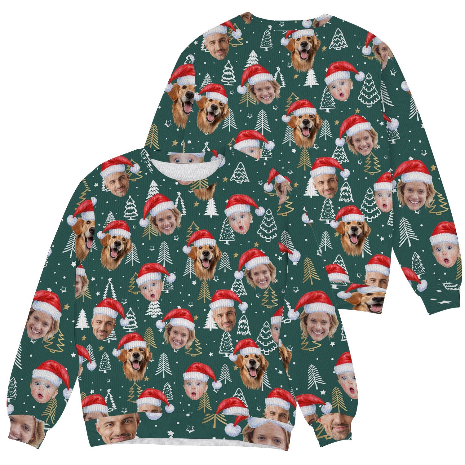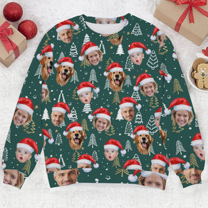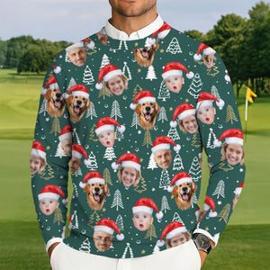 Custom Face Pine Tree Pattern Dark Green Golf Ugly Sweater, Christmas Golf Shirt, Golf Sweater