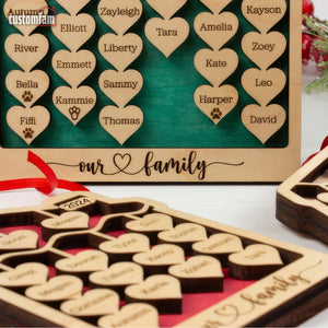 The ornament displayed here was designed for a grandma who has five children of her own and they each have their own families. Each column of hearts represents a family. The top names are the children, then their wives/husbands, then their kids. Each family has its names connected by their own string.
