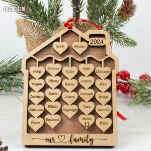 Decorate your Christmas Tree with a personalized wooden ornament featuring the names of all the members of the family, including pets. This ornament was designed as a multiple family ornament that all share the same roots (parents, grandparents, great grandparents). This family ornament is suitable for families with up to 44 members. Each member will have the name inside a heart. The pets get a paw engraved under their name. Angel wings and baby feet can also be added under the name in the heart.