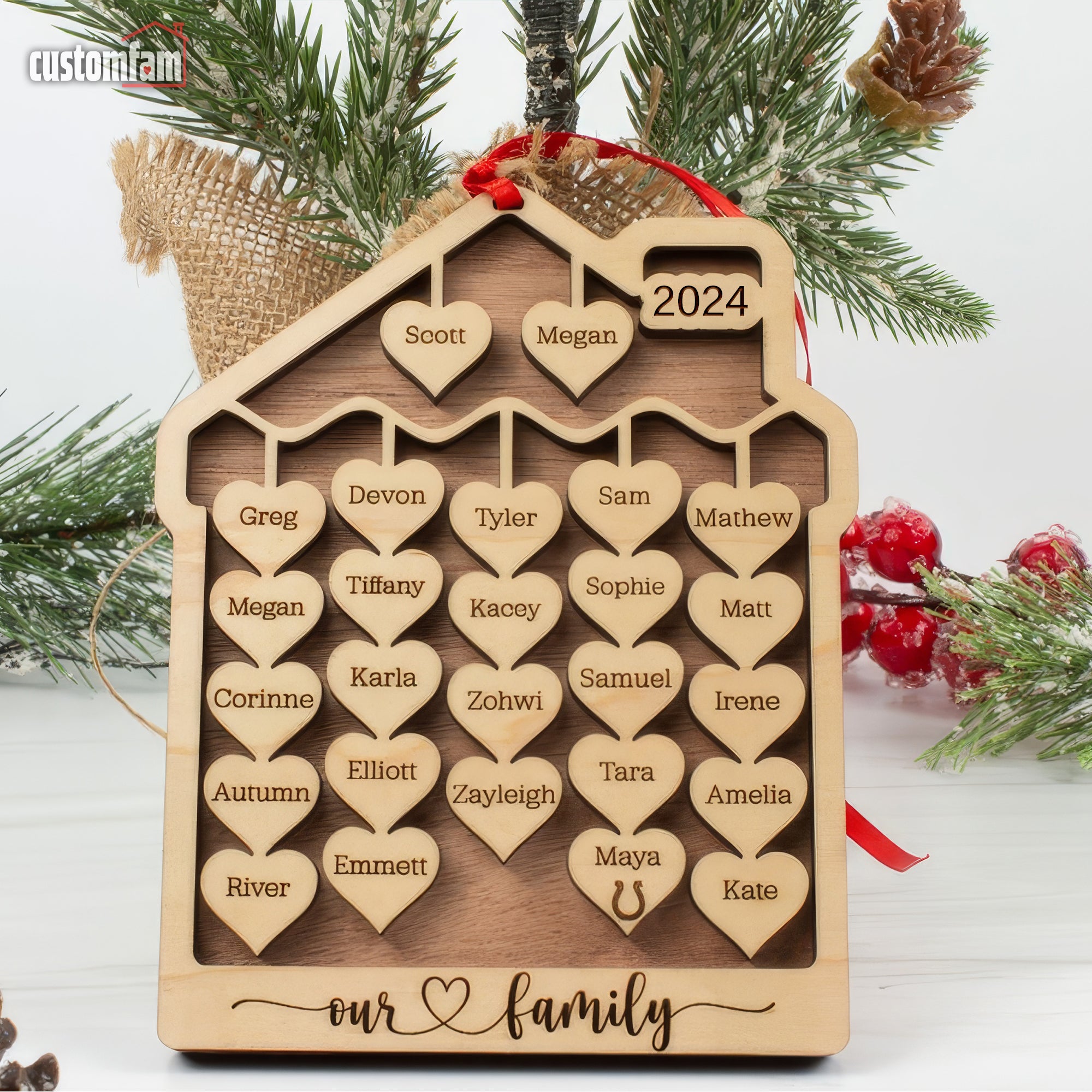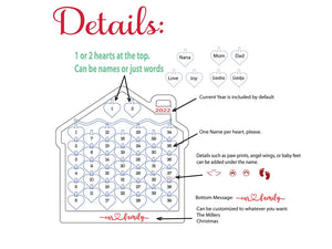- The ornament has been redesigned for 2024 to better fit the customer needs as observed previously. It now has two optional hearts at the top. These hearts can have the parents' names, grandparents' names, or just 2 words, "Joy", Love"," Grateful", "Thankful", "Fur" "Babies".